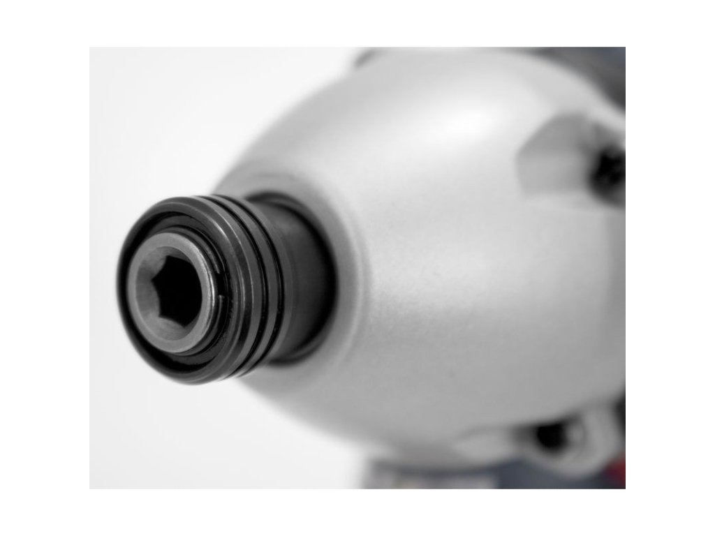 Akumulátorový rázový uťahovák zo série akumulátorového náradia 12V E3. Príručný a výkonný, dlhý len 159 mm. Upínanie nástrojov 1/4" Hex. Elektronika s reguláciou otáčok a ochranou proti preťaženiu. Pravo/ľavobežný chod s brzdou motora. Robustný obal prevodovky z hliníkovej zliatiny. Pogumovaná rukoväť pre bezpečnú prácu. Klip na opasok. Ukazovateľ kapacity akumulátora. Integrovaná LED k osvetleniu pracovnej oblasti. Bez batérie a nabíjačky.