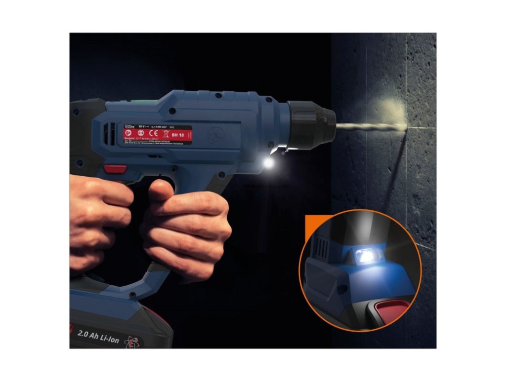 Akumulátorové vŕtacie kladivo zo série akumulátorového náradia 18V E3. Pogumovaná rukoväť pre bezpečnú prácu, variabilná, odnímateľná prídavná rukoväť. Kovový doraz na nastavenie hĺbky vŕtania, upínanie nástrojov SDS plus. Pravý/ľavý chod, možnosť vypnutia vŕtania s príklepom, zastavenie otáčania pre ľahké sekacie práce, LED pracovné svetlo, 4 funkcie: vŕtanie/sekanie/vŕtanie s príklepom/zastavenie otáčania. Dodáva sa bez akumulátora a nabíjačky.
