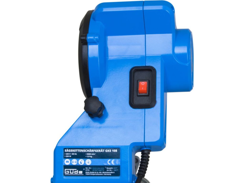 Elektrická brúska na brúsenie reťazí reťazových píl s uhlom ostrenia 2 x 35°, uhol nastaviteľný pomocou ručného kolieska. Nábehový uhol ostria 60° pevný, obmedzenie hĺbky brúsenia, vodiaca lišta reťaze s variabilne nastaviteľným dorazom, upnutie reťaze pomocou napínacej páky. Na stacionárnu montáž. Na ostrenie všetkých bežných typov reťazí (nábehový uhol ostria 60°). Vrátane brúsneho kotúča 108 x 23 x 3,2 mm.