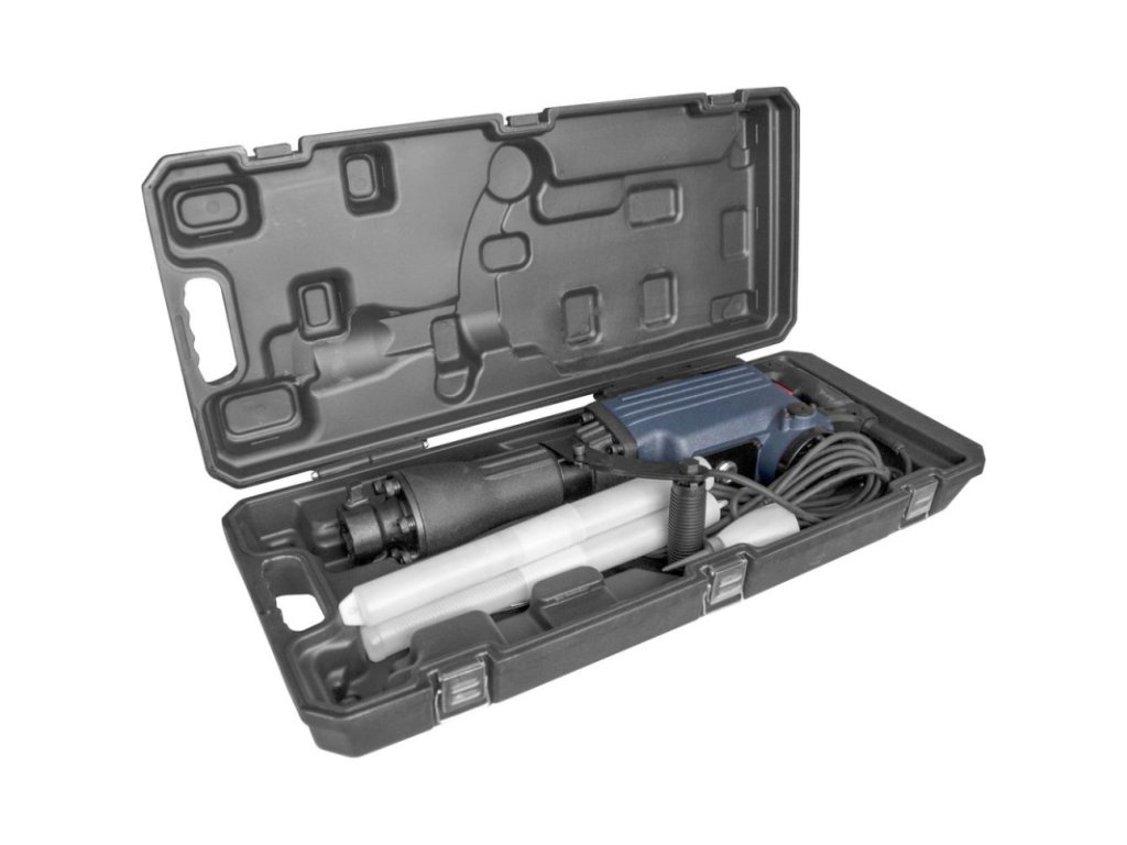 Sekacie kladivo s robustným kovovým puzdrom a ergonomicky tvarovanou prídavnou rukoväťou s tlmením vibrácií pre šetrnú prácu bez únavy. Na všetky materiály ako murivo, obkladačky, potery a podobne. S beznástrojovým držiakom dláta je výmena sekáčov bleskurýchla, 30 mm šesťhranný držiak nástrojov. Uzamykateľný spínač na nepretržitú prevádzku poskytuje ďalší pracovný komfort. Vysokokvalitný gumový kábel s dĺžkou 5 m (H07RN-F) vám poskytuje čo najväčšiu mobilitu počas práce. Vrátane plochého a špicatého sekáča 400 mm, kľúča, nádoby na skladovanie oleja. Kvalitný prepravný kufor s kovovými prackami a pevnými kolieskami.