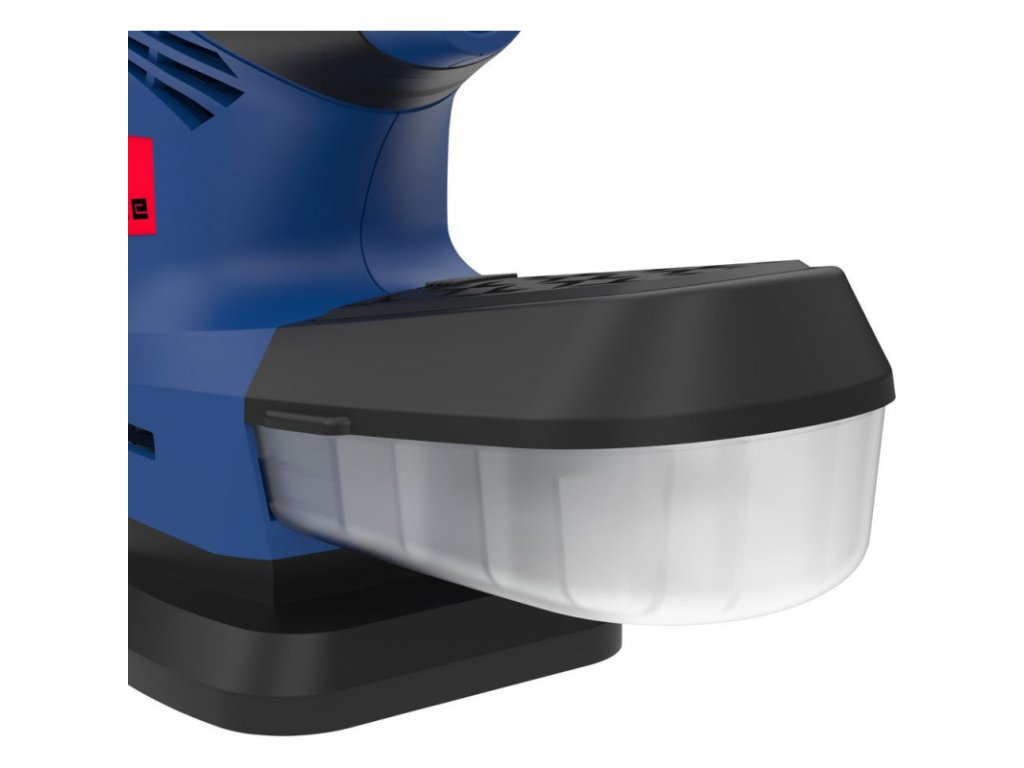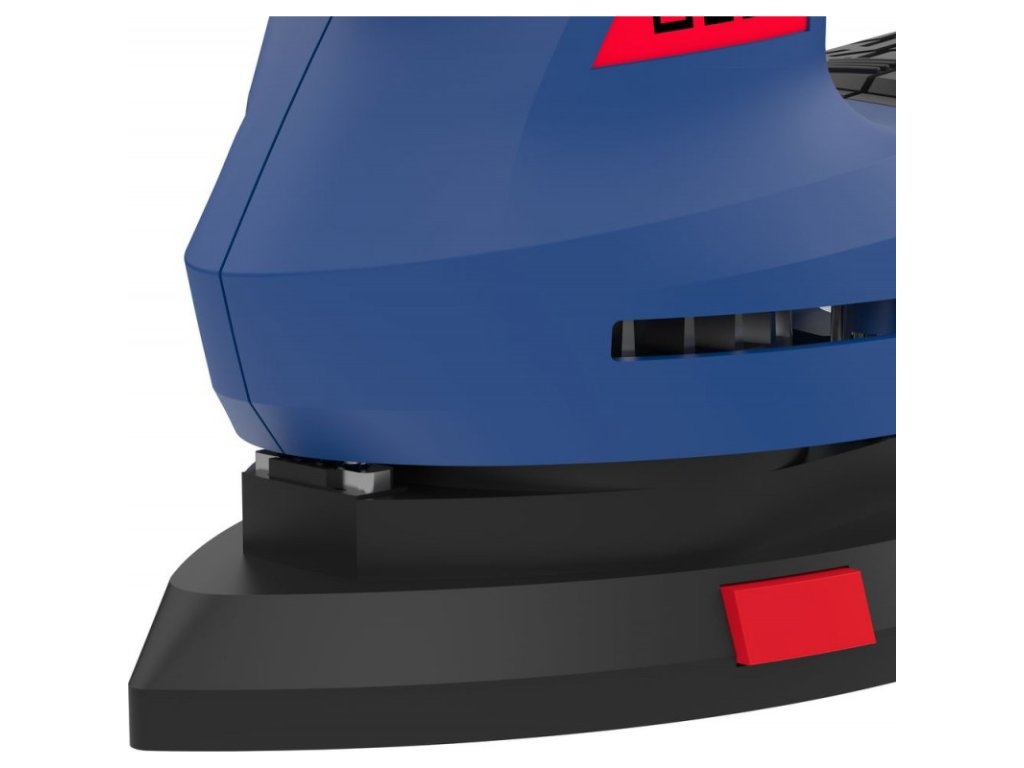 Brúska s ergonomickou protišmykovou rukoväťou pre prácu jednou rukou. Brúsna podložka so suchým zipsom na rýchlu výmenu brúsneho papiera. Štvorpolohová otočná delta brúsna platňa. Prstová brúsna platňa pre ťažko dostupné miesta. Zapínač/vypínač pre nepretržitú prevádzku. Integrovaný systém odsávania prachu so zberačom prachu pre efektívne odsávanie prachu. Vrátane zberaču prachu, 1x brúsneho papiera delta 140x93 mm (K=80), 1x prstového brúsneho papiera 85x25 mm (K=80).