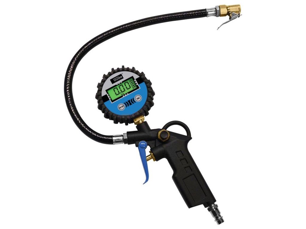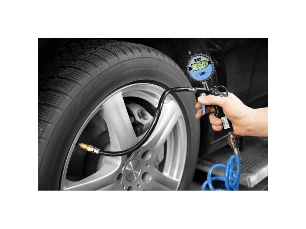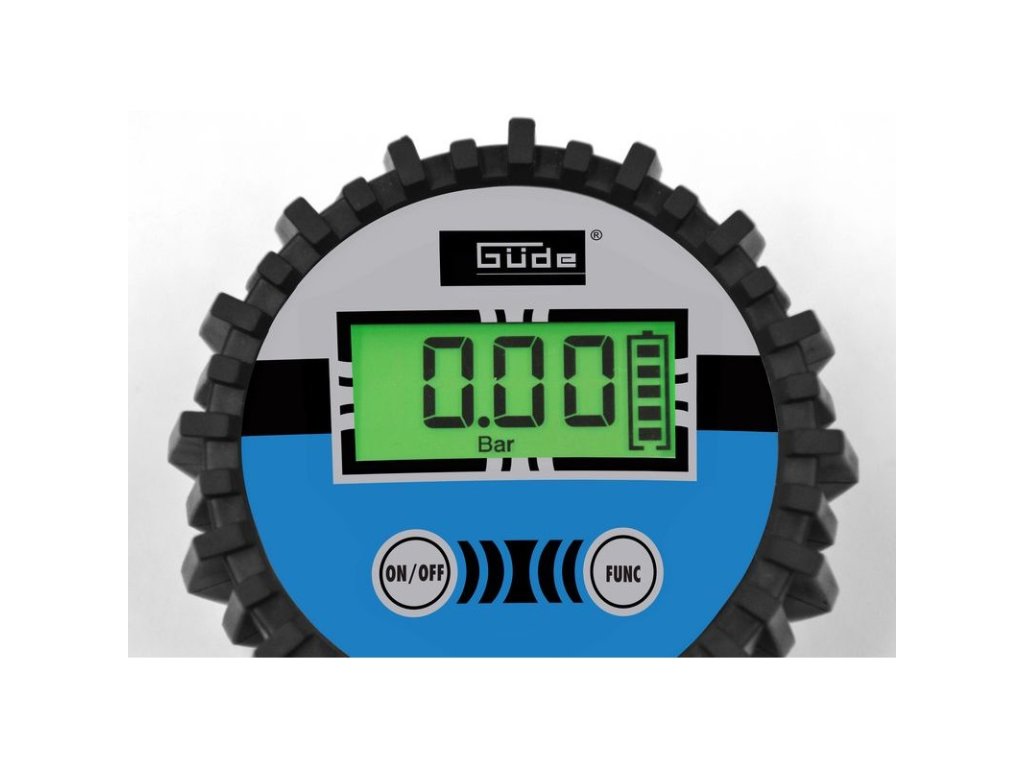 Hustilka pneumatík so 4-miestnym digitálnym ukazovateľom, umožňuje kontrolu tlaku vzduchu v pneumatikách a plnenie pneumatík. Gumová manžeta odolná proti nárazom chráni tlakomer pred ľahkými nárazmi a zachováva jeho funkčnosť. Rukoväť a kryt sú vyrobené z tlakovo liateho hliníka. Citlivá plniaca páka umožňuje presné naplnenie pneumatík. Indikátor manometra je rozdelený na kroky po 0,1 bar a je zobrazený na štvormiestnom digitálnom displeji v Bar/Psi/Kpa a kgf na cm2. Súčasťou balenia je prípojná vsuvka, vypúšťací ventil stlačeného vzduchu a zátka ventilu, 2 batérie typu AAA.