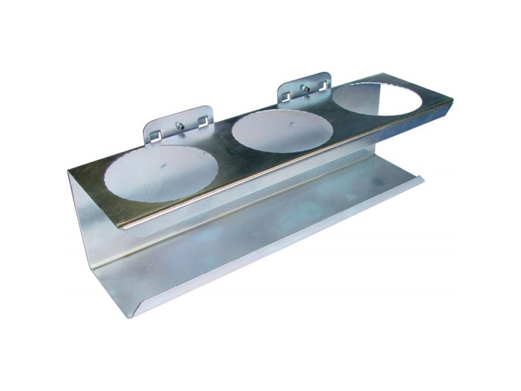Držiak 3 okrúhlych nádob na uchytenie do perforovanej steny a systémov so štvorcovými otvormi 8x8 - 10x10 mm, stredovou vzdialenosťou otvorov 38 mm vertikálne a horizontálne. Držiak na 3 dózy s maximálnym priemerom 70 mm. V balení 1 ks.