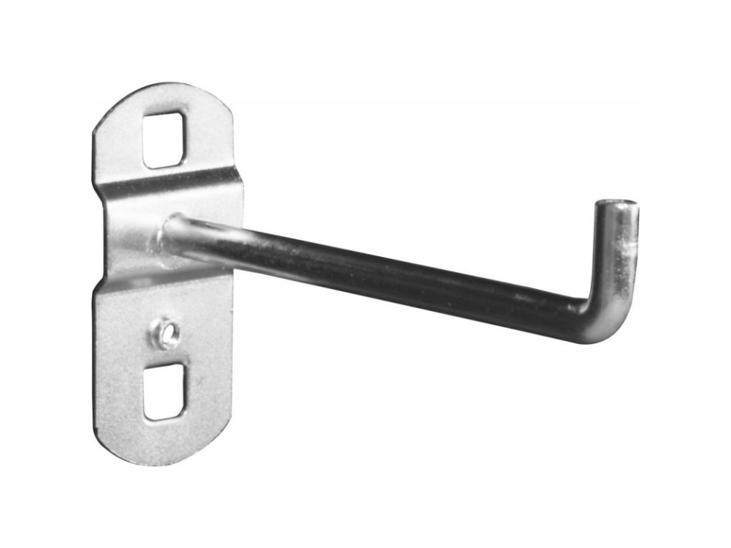 Držiak dielenského náradia a nástrojov na uchytenie do perforovanej steny a systémov so štvorcovými otvormi 8x8 - 10x10 mm, stredovou vzdialenosťou otvorov 38 mm vertikálne a horizontálne. Kolmé zakončenie háčika, hĺbka 90 mm. V balení 1 ks.