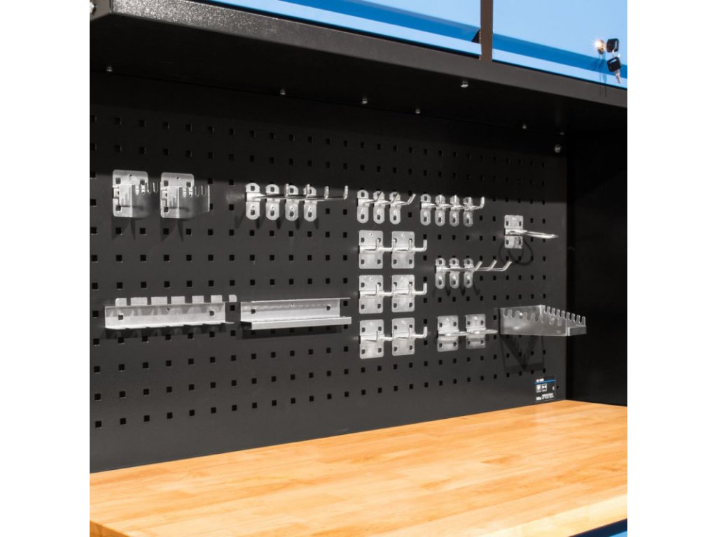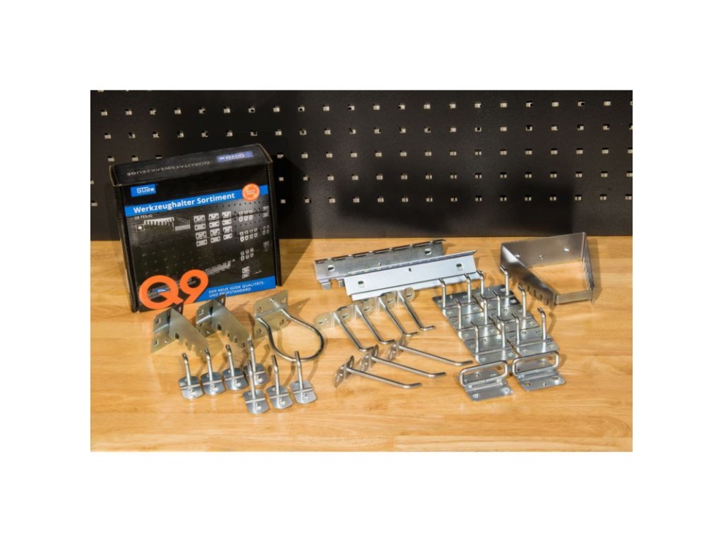 Držiaky nástrojov a háčiky v súprave sú vhodné na uchytenie do perforovanej steny a systémov so štvorcovými otvormi 10 x 10 mm, stredovou vzdialenosťou otvorov 38 mm vertikálne a horizontálne.