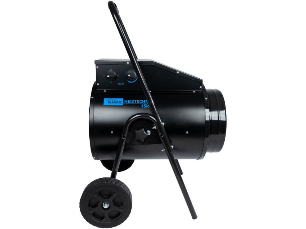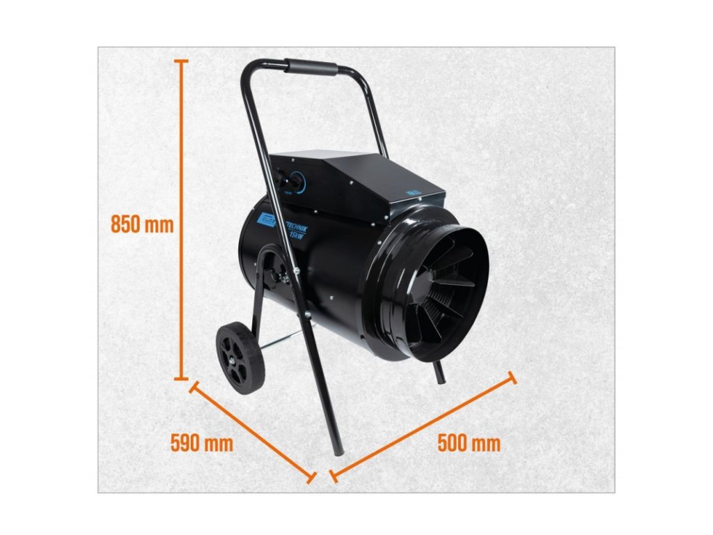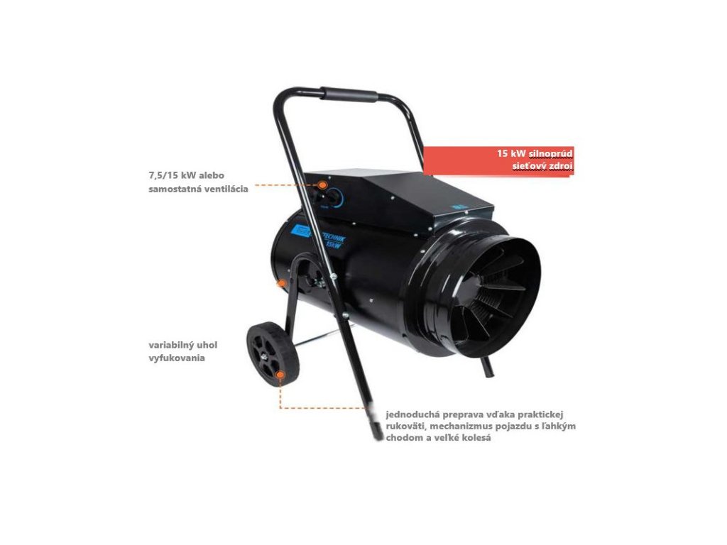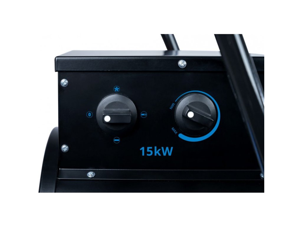 Výkonný elektrický vyhrievací ventilátor 15 kW (400 V) má dva stupne vykurovania, možnosť samostatnej ventilácie a disponuje integrovaným ovládaním termostatu. Rýchlo zvýši izbovú teplotu, distribúciu tepla a vzduchu v miestnosti je možné individuálne nastaviť vďaka variabilnému uhlu sklonu a vyfukovania. Vysoký prietok vzduchu a zabudované bezpečnostné opatrenia zaručujú, že sa ideálne hodí na reguláciu teploty vo veľkých vnútorných priestoroch. Plynule nastaviteľný termostat pre individuálne prispôsobenie tepla a udržiavanie konštantnej teploty. Maximálna bezpečnosť vďaka ochrane proti prehriatiu. Praktická rukoväť a veľké kolesá pre pohodlnú a bezpečnú prepravu.