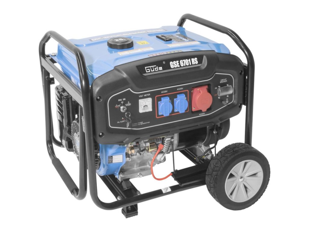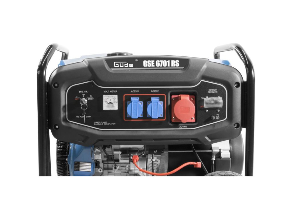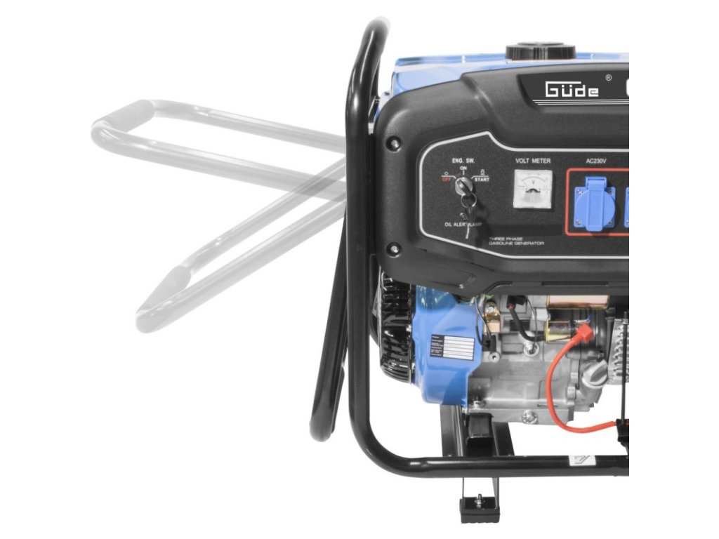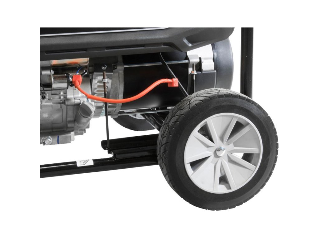 Elektrocentrála so 4-taktným synchrónnym generátorom, AVR (automatická regulácia napätia pre stabilný výkon), 2 x Schuko 230 V / 50 Hz, 1 x 400 V / 50 Hz, skladacia transportná rukoväť pre úsporu miesta pri skladovaní, podvozok s veľkými kolesami pre ľahké premiestňovanie, reverzný štartér. Ochrana proti preťaženiu, ochrana pri nízkej hladine oleja, voltmeter. Elektrický štart kľúčom zapaľovania pomocou 12 V batérie. Dodávané bez batérie pre elektrický štart. Tento generátor nie je vhodný na prevádzku elektronicky citlivých prístrojov, ako sú notebooky, smartfóny alebo zvukové systémy.