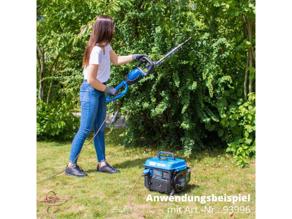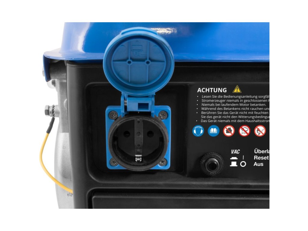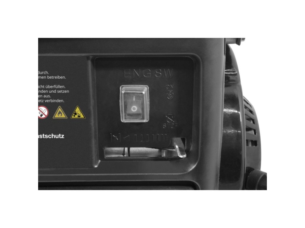 Elektrocentrála s 2-taktným synchrónnym generátorom, 1 x Schuko 230 V / 50 Hz, praktická rukoväť, antivibračné gumené nožičky, reverzný štartér, ochrana proti preťaženiu. Tento generátor nie je vhodný na prevádzku elektronicky citlivých prístrojov, ako sú notebooky, smartfóny alebo zvukové systémy.