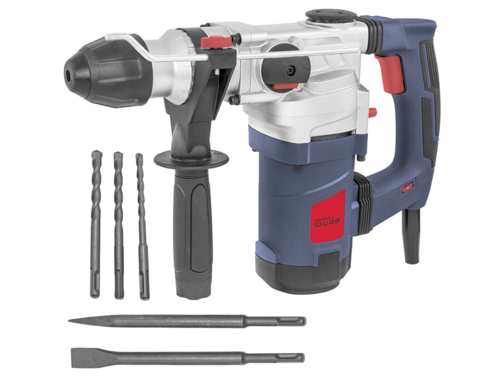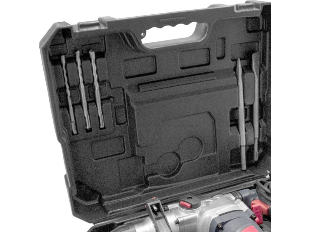 Kombinované kladivo s antivibračným systémom, so 4 funkciami: vŕtanie, sekacie práce, vŕtanie s príklepom, otáčkový doraz. Mäkká rukoväť pre ergonomickú a bezpečnú prácu. Variabilná, odnímateľná prídavná rukoväť. Kovový hĺbkový doraz vŕtania s rýchloupínacím uzáverom. Rýchloupínacie skľučovadlo SDS plus na výmenu vrtákov bez náradia. Plynulá regulácia otáčok s plynulým rozbehom. Prírazový doraz na vŕtanie bez príklepu. Rotačný doraz na ľahké sekanie. Vrátane 3 ks vrtákov SDS-plus (Ø 8/10/12 mm), hĺbkového dorazu vŕtania, prídavnej rukoväte, plochého a špicatého sekáča 250 mm, krytu proti prachu a kľúča. Kvalitný prepravný kufor s kovovými prackami.