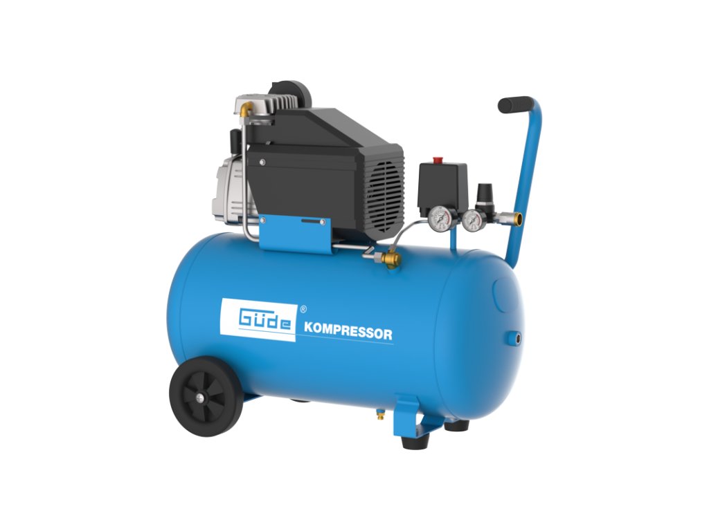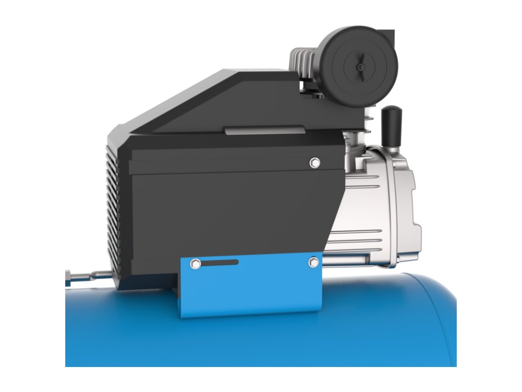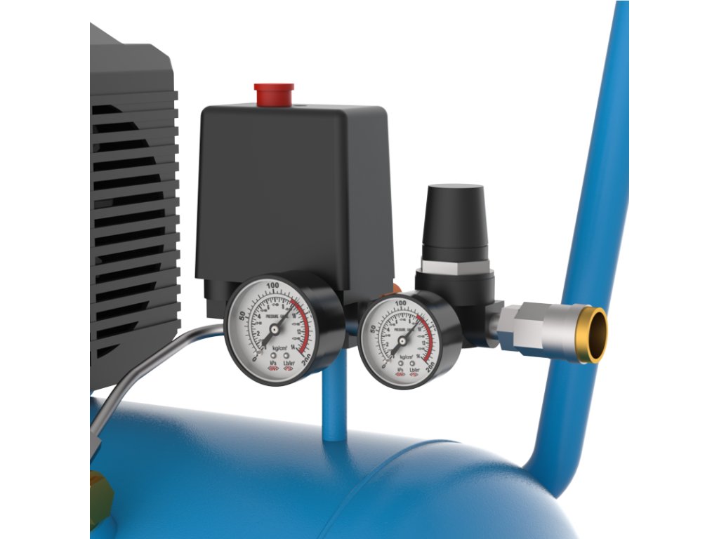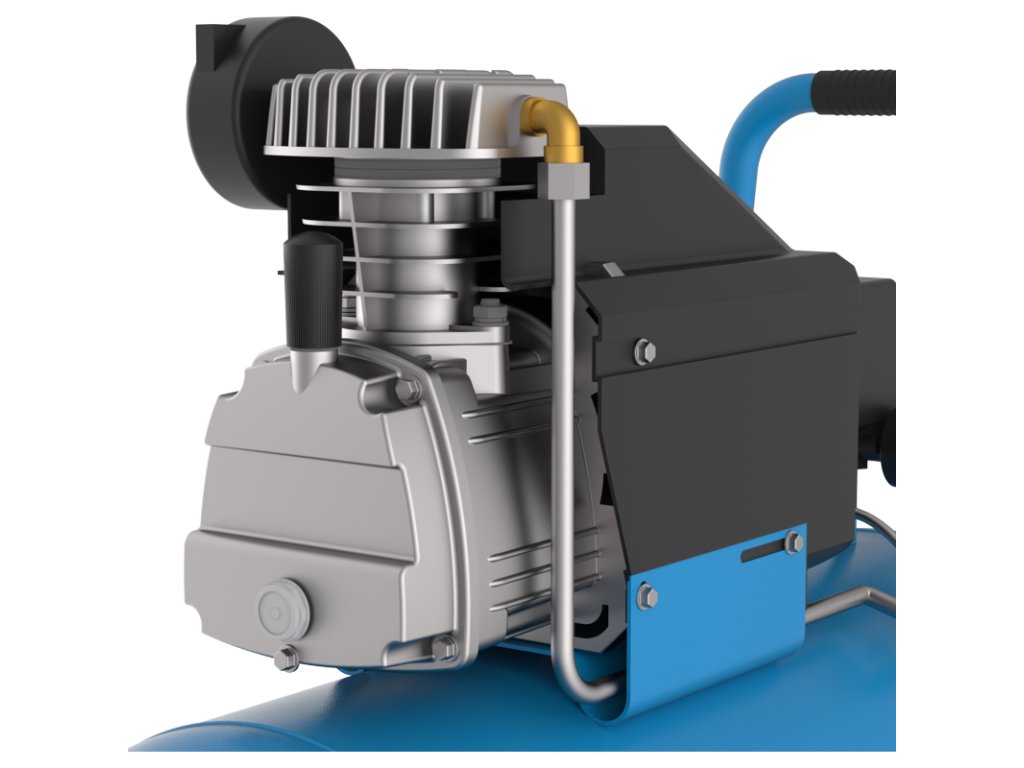 Jednovalcový piestový kompresor s olejovým mazaním, priamy pohon, dva manometre (manometer na meranie tlaku v nádobe a manometer na meranie pracovného tlaku), jedna spojka na stlačený vzduch, redukčný, bezpečnostný a spätný ventil, vzduchový filter, transportná rukoväť. Nožičky s gumovým dorazom, plastové kolesá.