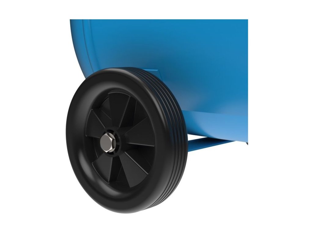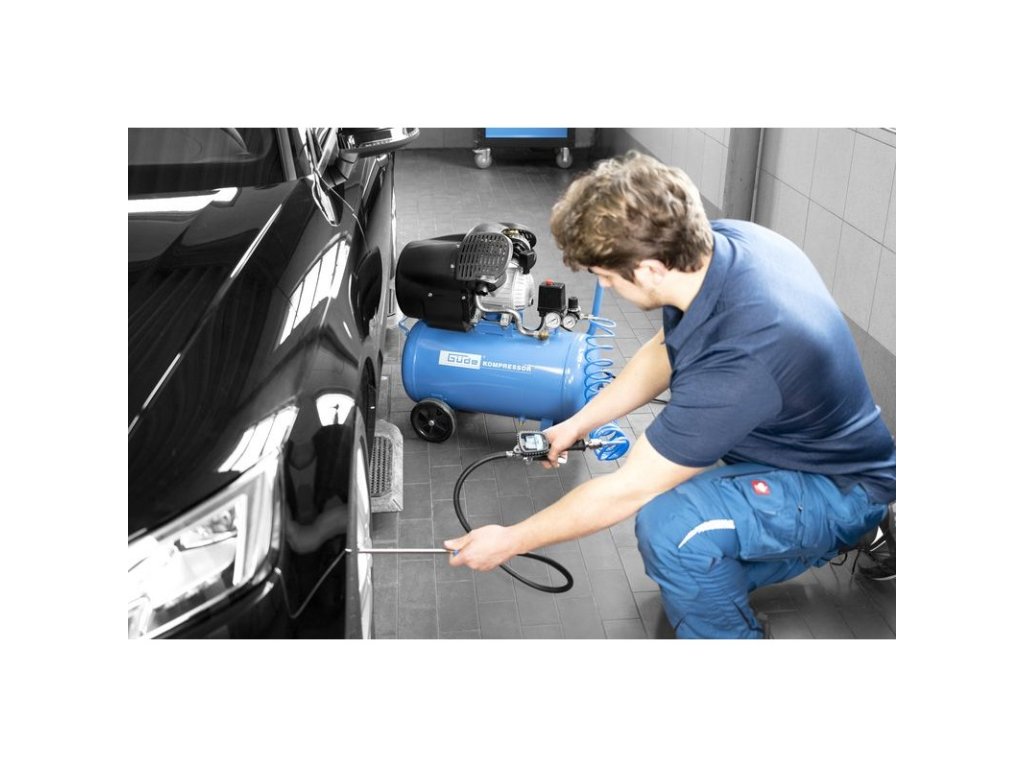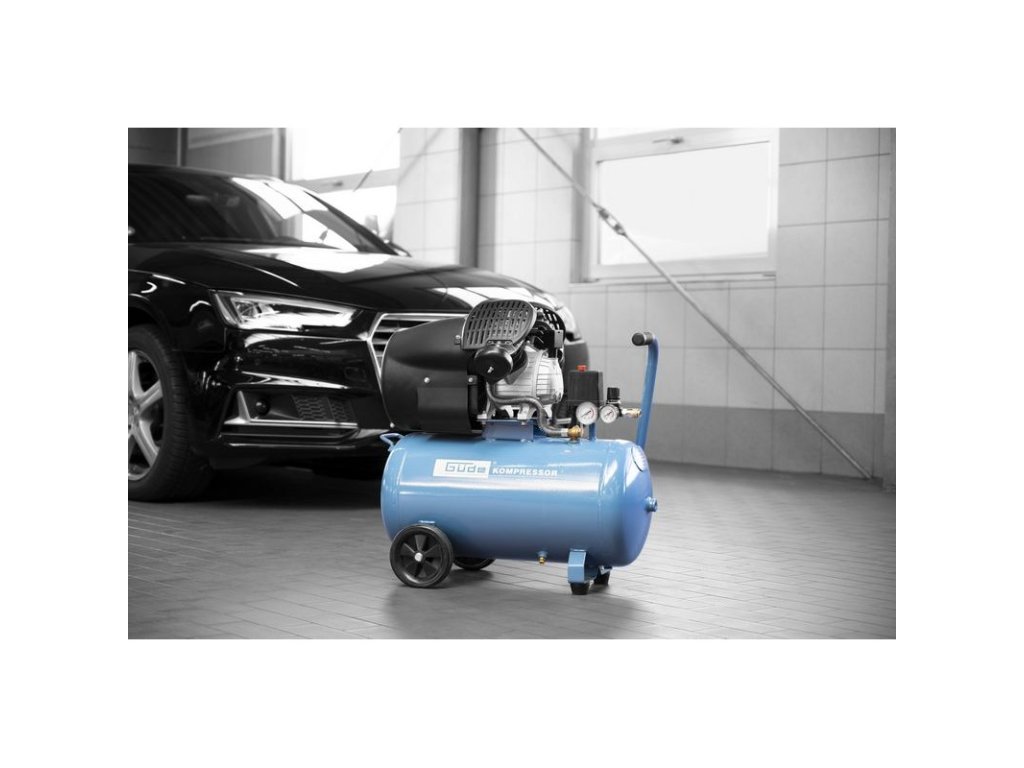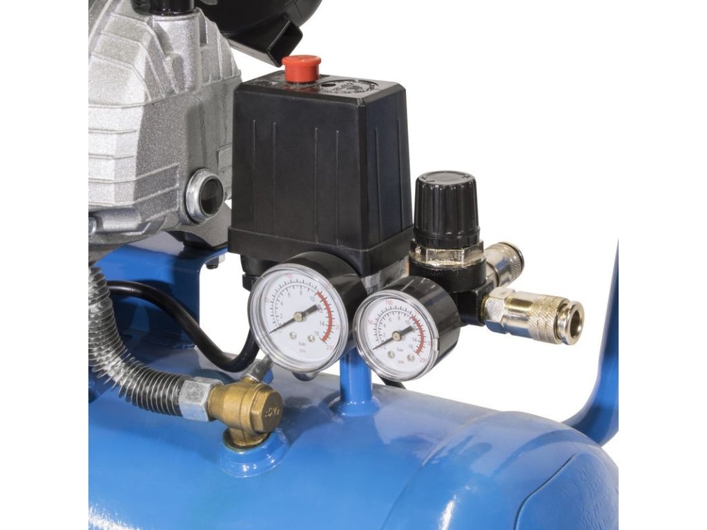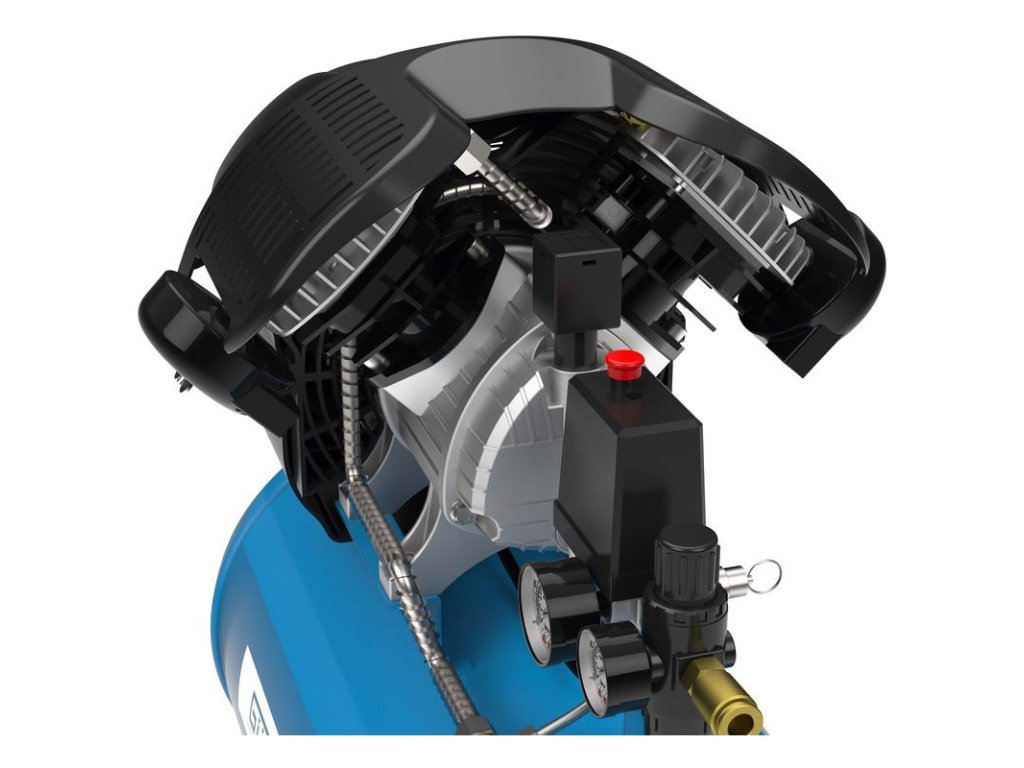 Dvojvalcový V-agregát s olejovým mazaním, s priamym pohonom. Tlakový spínač, manometer tlaku v nádobe a manometer pracovného tlaku, 2 spojky na stlačený vzduch, redukčný ventil, poistný ventil, spätný ventil, vypúšťací ventil na kondenzát, vzduchový filter. Dvojitá noha s gumovým nárazníkom, plastové kolesá, prepravná rukoväť.