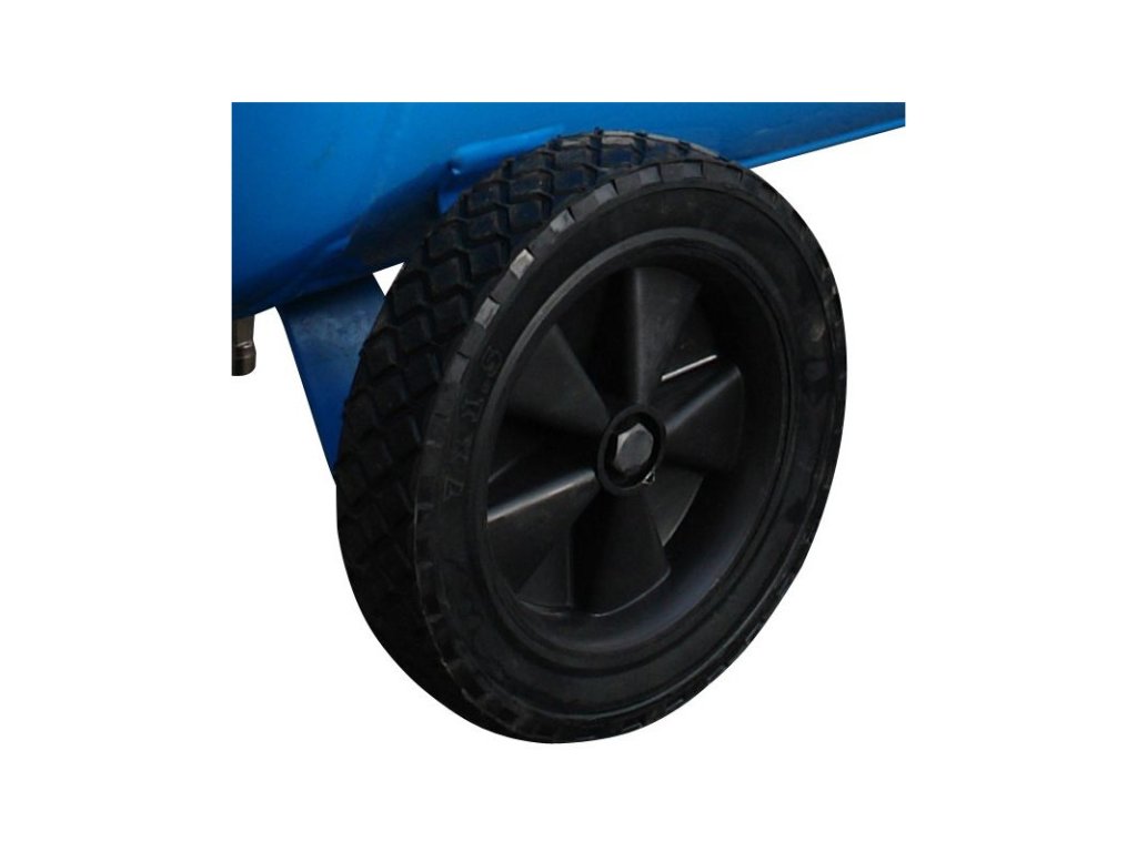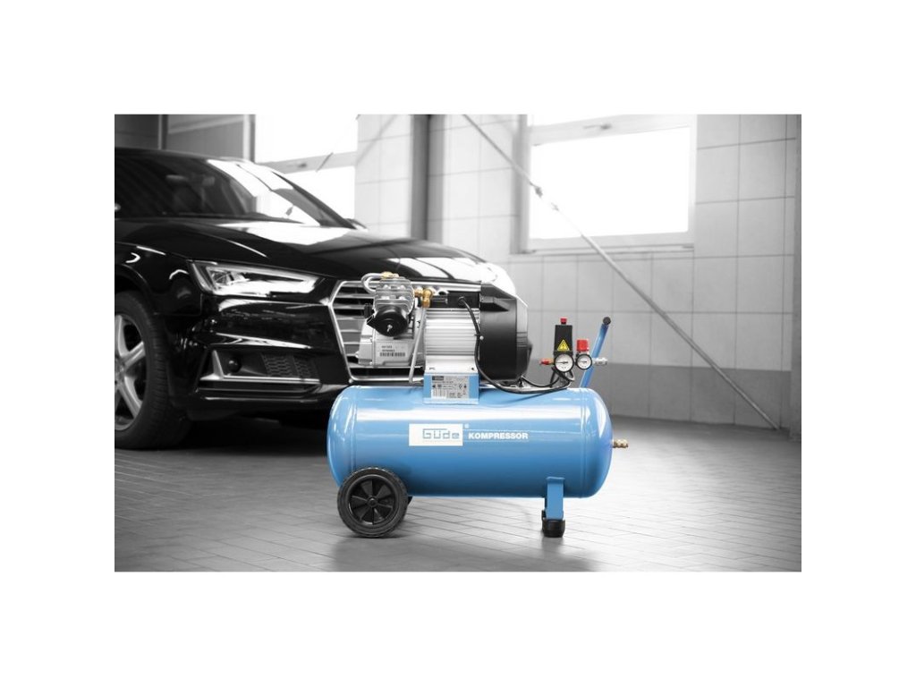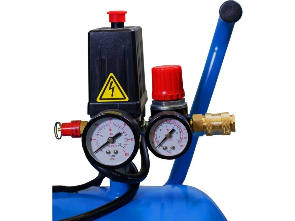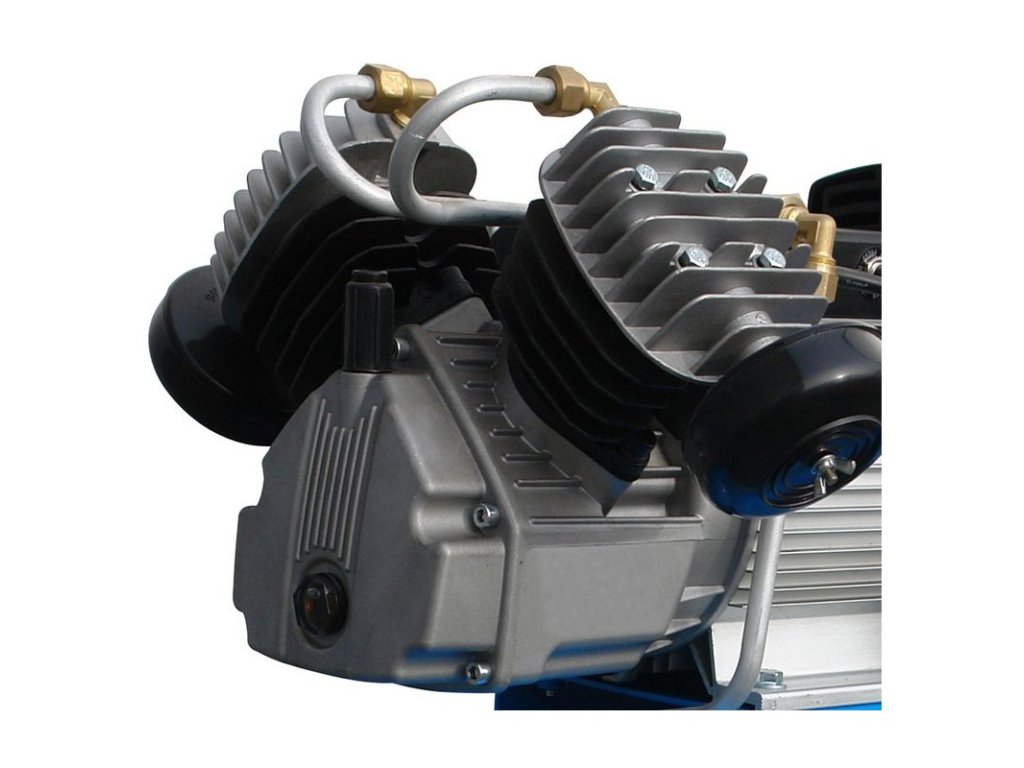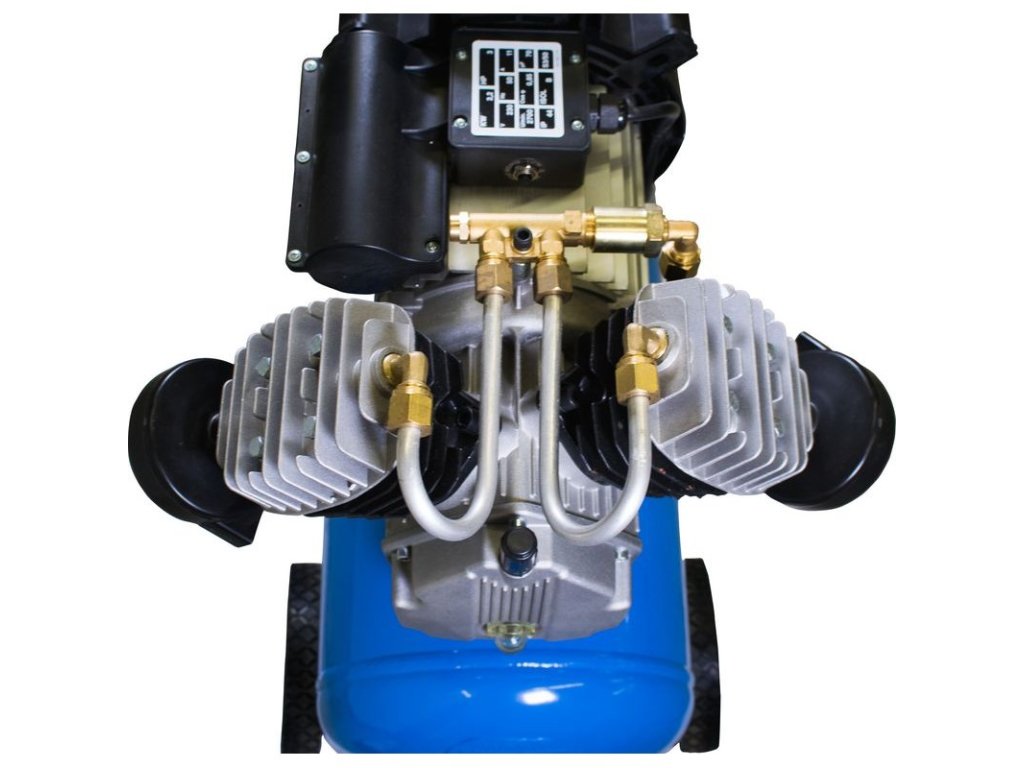 Dvojpiestový kompresor s olejovým mazaním, V-agregát s priamym pohonom. Tlakový spínač, manometer tlaku v nádobe a manometer pracovného tlaku, 2 spojky na stlačený vzduch, redukčný ventil pracovného tlaku, poistný ventil, vypúšťací ventil na kondenzát, vzduchový filter. Dvojitá noha s gumovým nárazníkom, plastové kolesá, prepravná rukoväť.