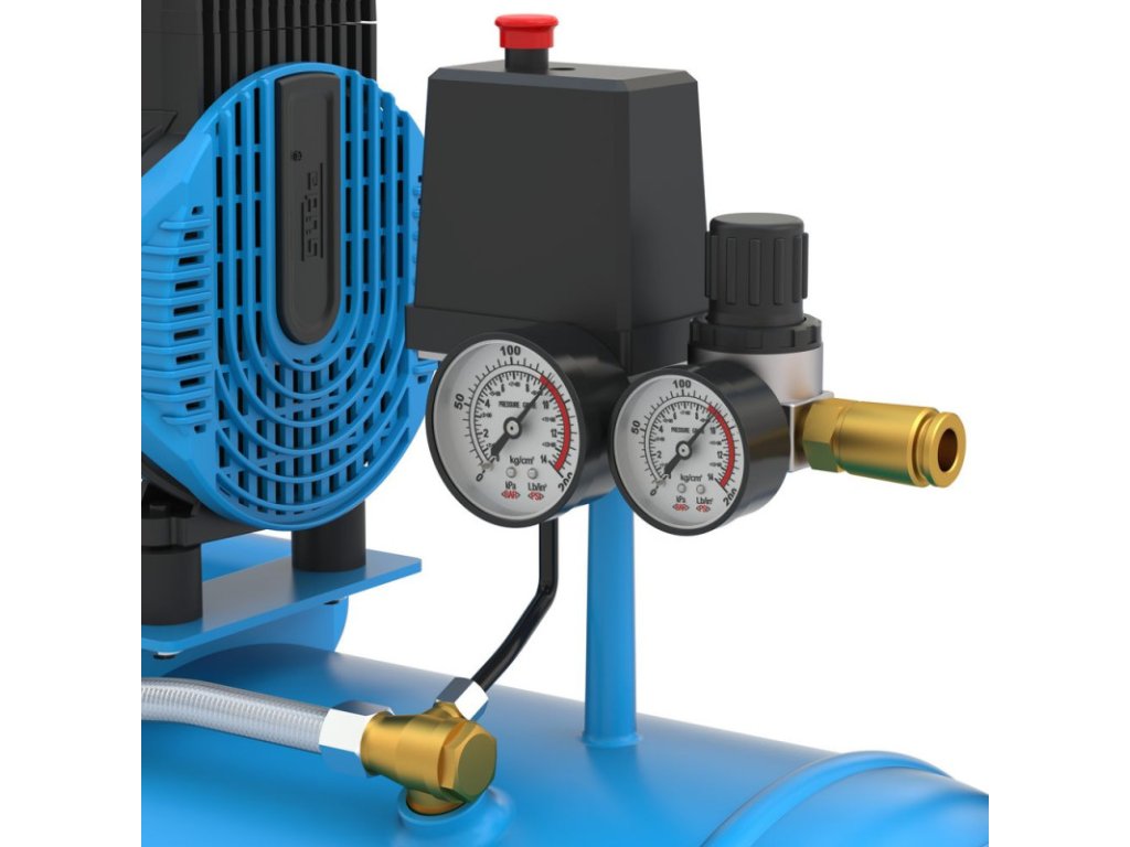 Bezolejový a bezúdržbový dvojvalcový piestový kompresor, dvojpiestový agregát, indukčný motor podávajúci výkon 1,68 kW, rýchlosť kompresora 2800 ot./min. pre vysoký sací výkon. Mechanický tlakový spínač, manometer na meranie tlaku v nádobe a pracovného tlaku, 50-litrová nádoba. Rukoväť na prenášanie a otočné kolieska. Kompresor s tichým chodom, dve pneumatické spojky, bezpečnostný ventil a vypúšťacia skrutka na kondenzát.
