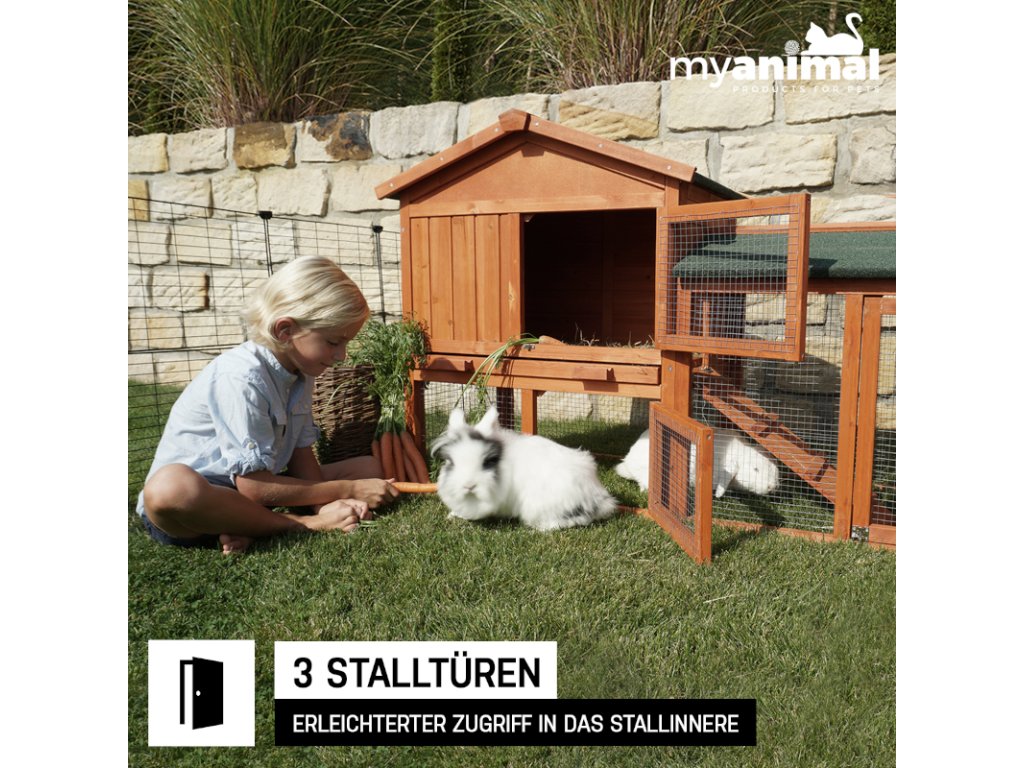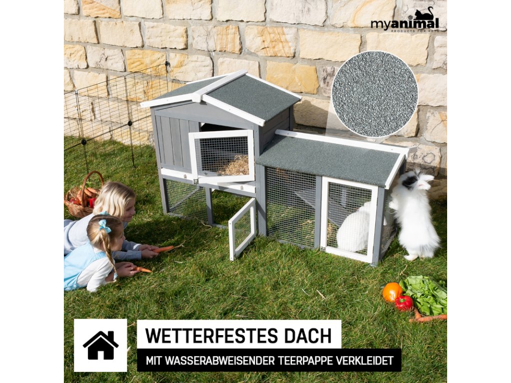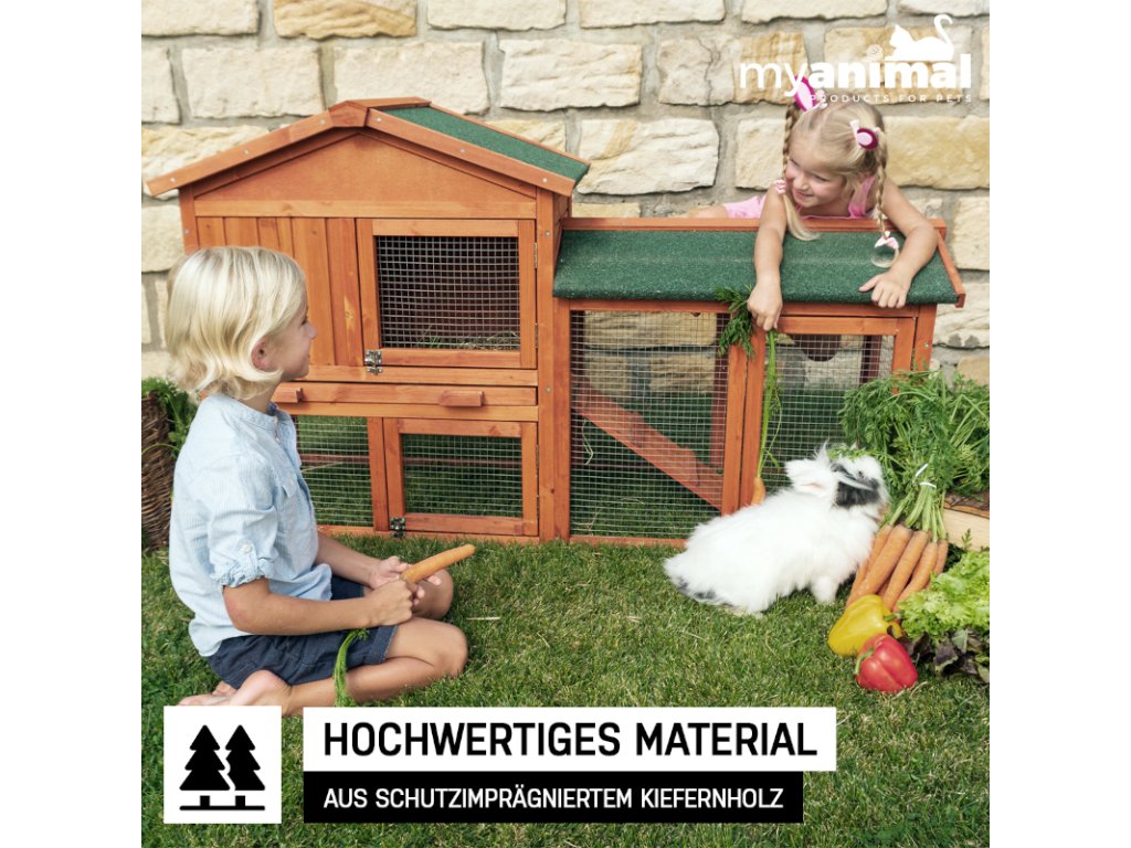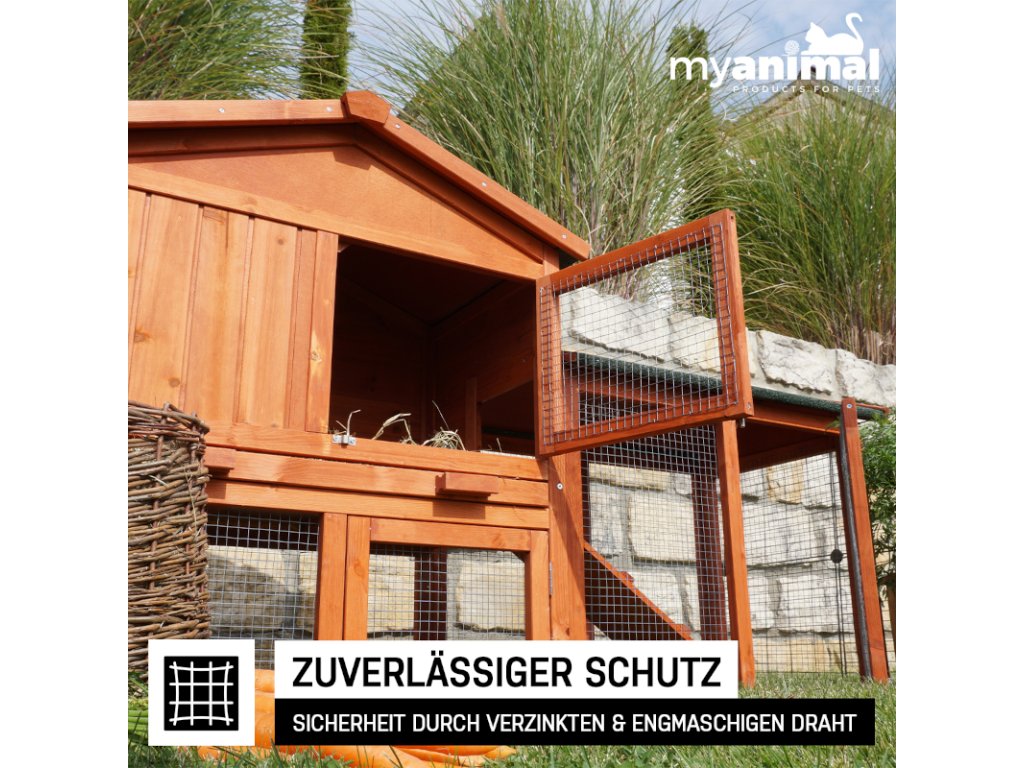 Použité borovicové drevo je precízne opracované a impregnované pre vysokú odolnosť voči počasiu. Králikáreň MyAnimal MH-03 2.0 poskytuje králikom bezpečný, komfortný a odolný domov – navrhnutý s dôrazom na pohodu zvierat.
