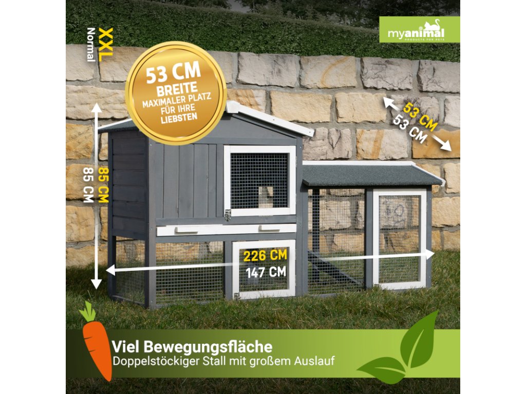 Aj králiky potrebujú pohyb – najlepšie v prírode. Táto králikáreň im poskytuje dostatok miesta, chránené úkryty a voľný pohyb. Ideálna aj pre chov viacerých králikov, ktorí tu nájdu priestor na hranie aj oddych. Kŕmenie a čistenie zvládnete rýchlo a jednoducho – niekoľkými pohybmi. Na dôkladné spracovanie a kvalitné materiály sa môžete spoľahnúť.