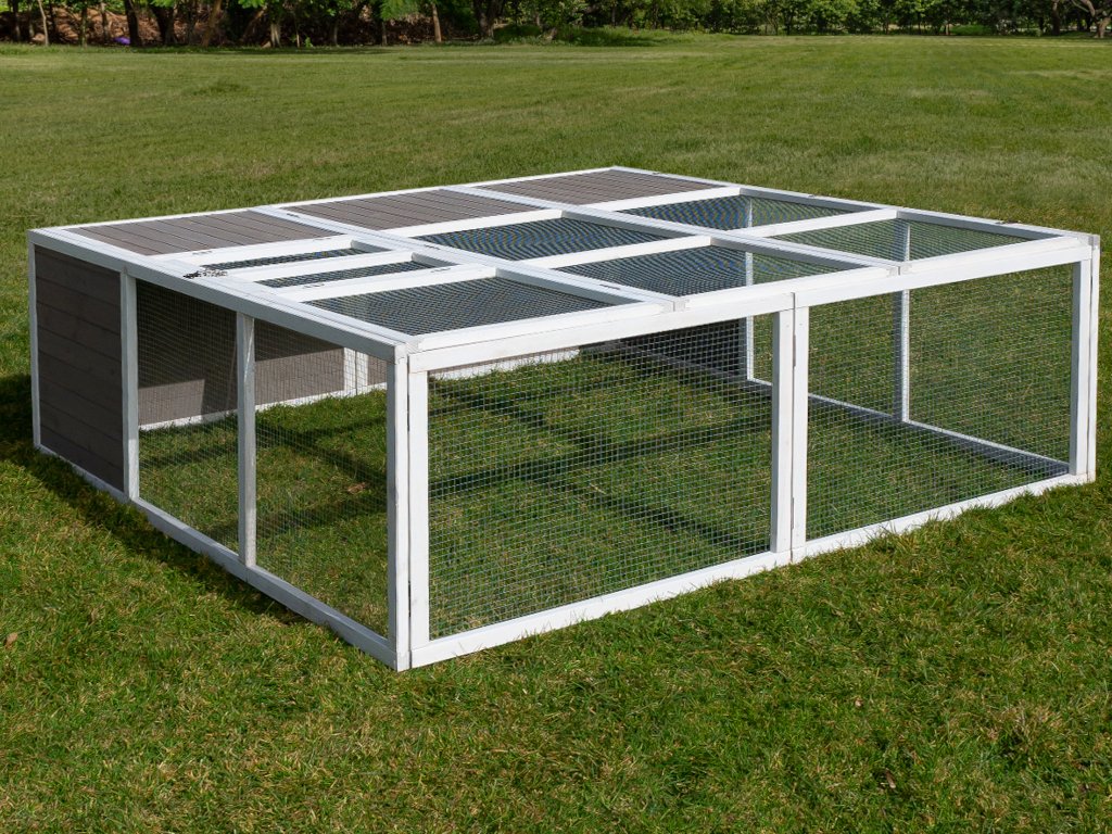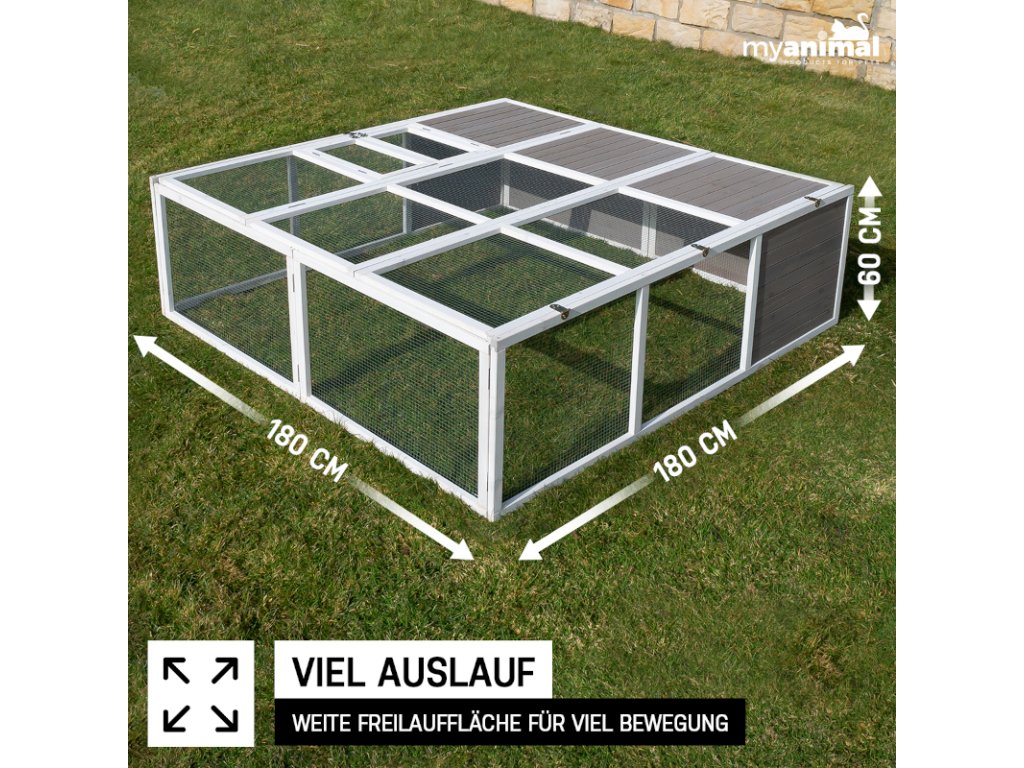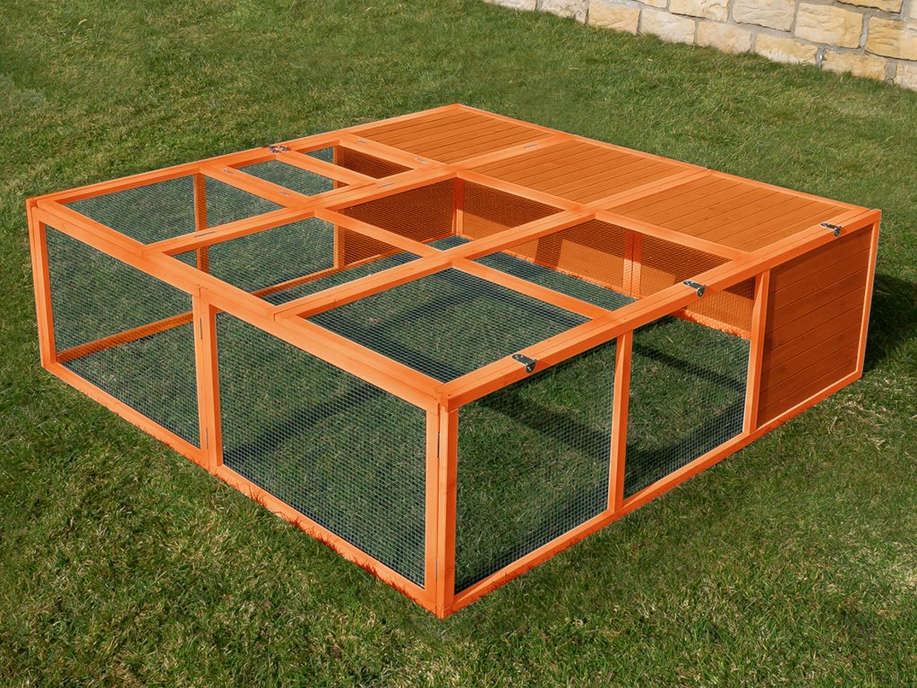 Voľná plocha s rozlohou viac ako 3 m², ktorú môžu vaše králiky využívať v XXL králikárni. S výškou 60 cm v uzavretej ohrade je dostatok miesta na šantenie.