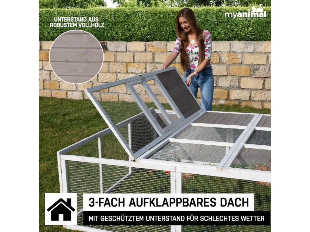 Králikáreň MyAnimal MH-06 dáva vašim králikom extra porciu slobody - vďaka 3-smernej skladacej streche. Po úplnom otvorení máte vy a vaše deti možnosť dostať sa ešte bližšie k svojim králikom pri spoločnej hre v králikárni.