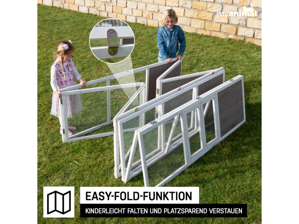 V tom, ako z veľkoformátového voľného výbehu pre králiky zložíte malé balenie behom chvíľky, je niečo magické. Vďaka jednoduchej funkcii skladania ho môžete pohodlne a priestorovo úsporne uskladniť v kôlni, pivnici, garáži alebo v krytom vonkajšom priestore. Niekoľkými jednoduchými pohybmi ho zložíte a vaše králiky môžu poskakovať vo veľkom výbehu, ako sa im zachce.