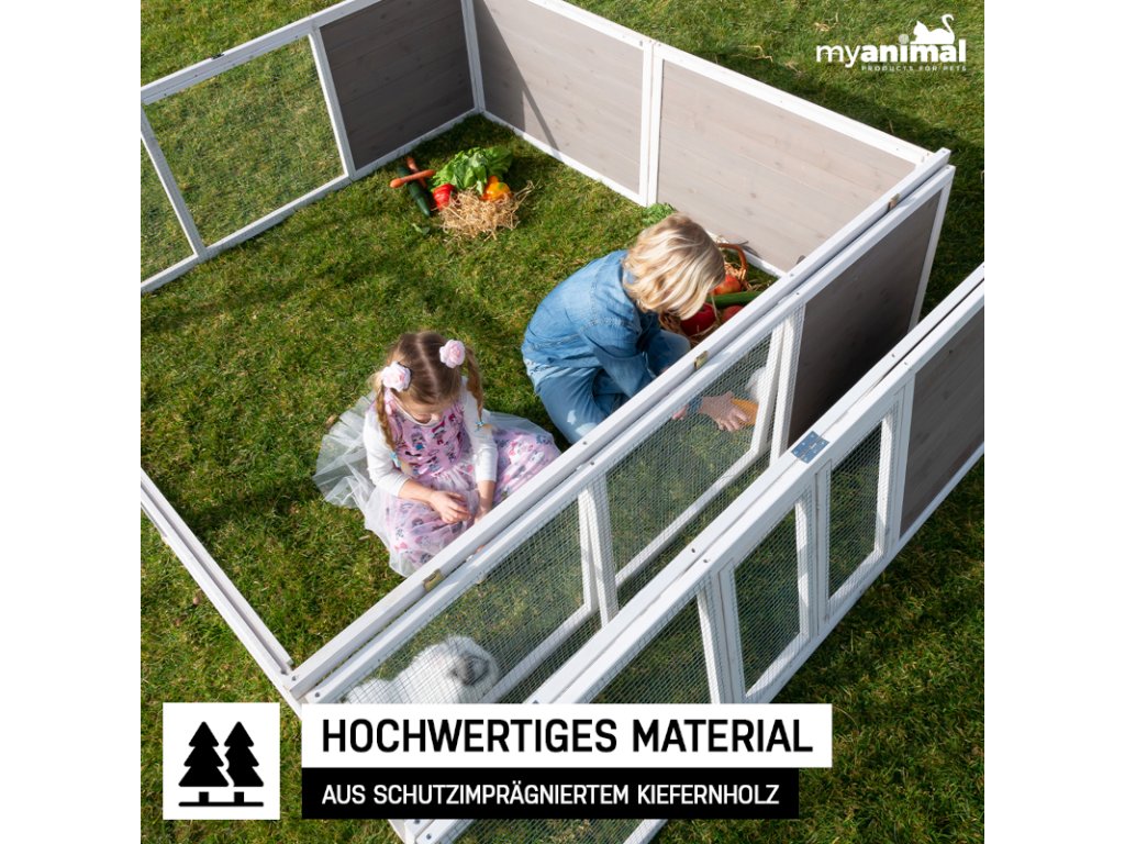 Aby ste sa z králikárne s vonkajším výbehom mohli vy a vaše králiky dlho tešiť, používame len kvalitný materiál, ktorý je overený praxou. To znamená, že všetky vzpery a ochranné prvky proti poveternostným vplyvom sú vyrobené z impregnovaného masívneho dreva. Všetky komponenty mriežky sú pevne spojené, takže odolajú typickým pokusom o hryzenie a ponúkajú bezpečnú a trvalú ochranu pred mnohými nezvanými návštevníkmi.