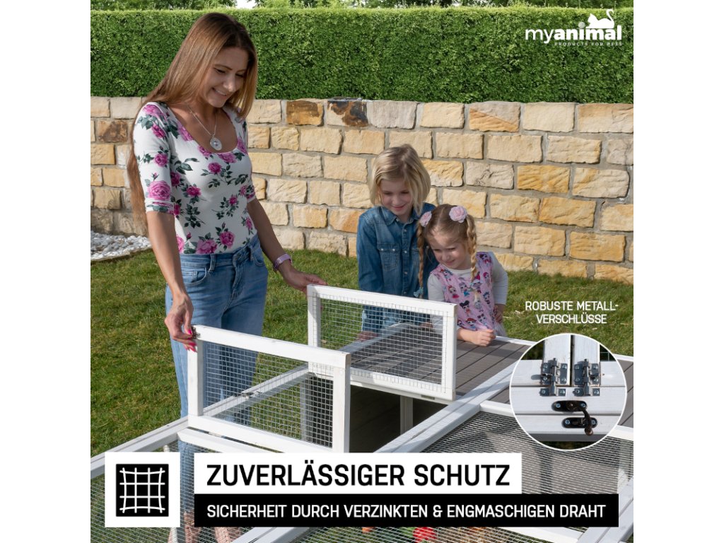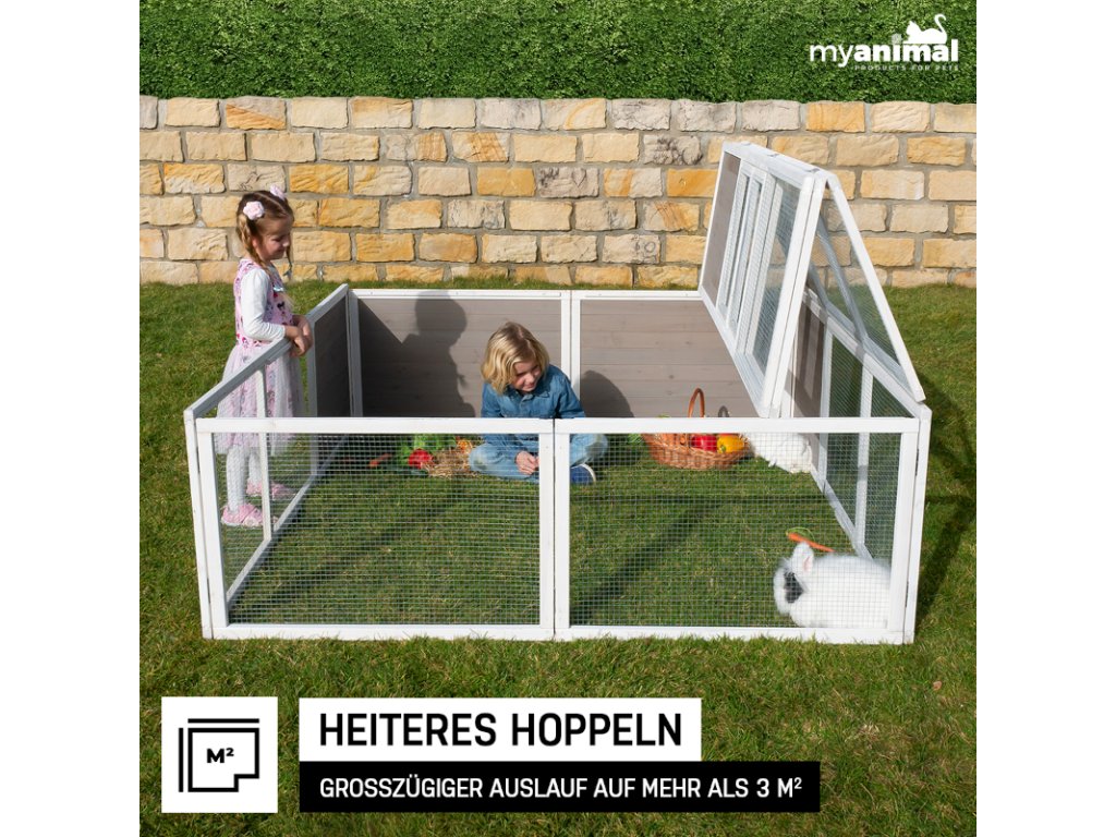V králikárni MyAnimal MH-06 majú vaše králiky dostatok miesta na poskakovanie. Vďaka 3-smernej skladacej streche si králiky s dlhými ušami môžu vo svojej králikárni užívať úplnú slobodu. Prístup máte cez veľkoformátový a uzamykateľný strešný otvor. Vysokokvalitné, starostlivo spracované materiály zaručujú kvalitu. Králikáreň s výbehom zaujme ochranným impregnovaným masívnym drevom a masívne rozmiestnenými kovovými mriežkami. Pohodlie nesmie chýbať. Pretože aj vaši zajačikovia sa potešia priestrannému prístrešku. Králikáreň MyAnimal MH-06 je vybavená praktickou funkciou jednoduchého skladania. Umožní vám králikáreň XXL jednoducho zostaviť a rozložiť a skladovať ju priestorovo úsporným spôsobom.