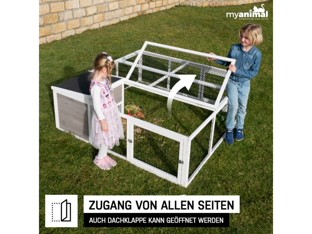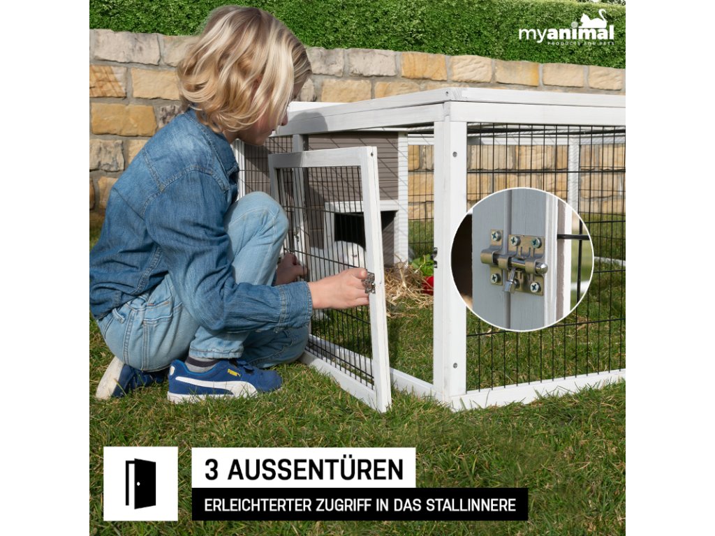 Kúpa králikárne je jednoduchá, čistenie nie je vždy jednoduché. Toto nie je prípad našej králikárne XXL s vonkajším výbehom: S tromi vonkajšími dverami a kvalitným strešným poklopom vždy umožňuje rýchly prístup do vnútra králikárne zo všetkých strán. Bez ohľadu na to, či chcete králikáreň MyAnimal MH-08 vyčistiť, vezmite svoje králiky von alebo ich nakŕmte: Vďaka dobre premyslenému dizajnu to možno urobiť v niekoľkých jednoduchých krokoch!