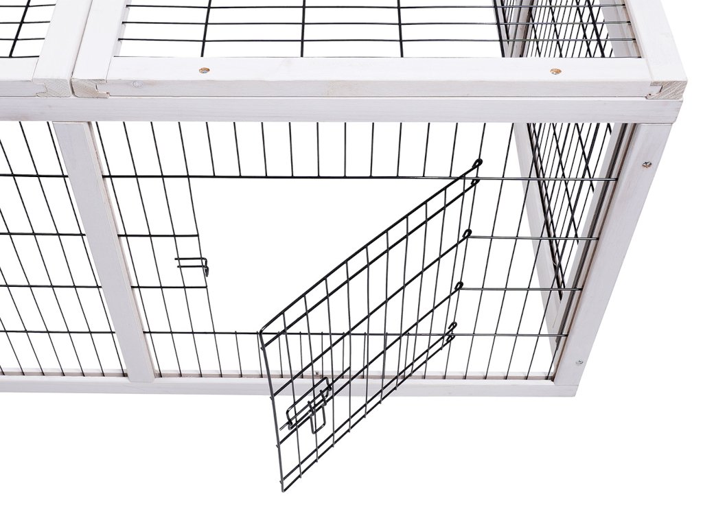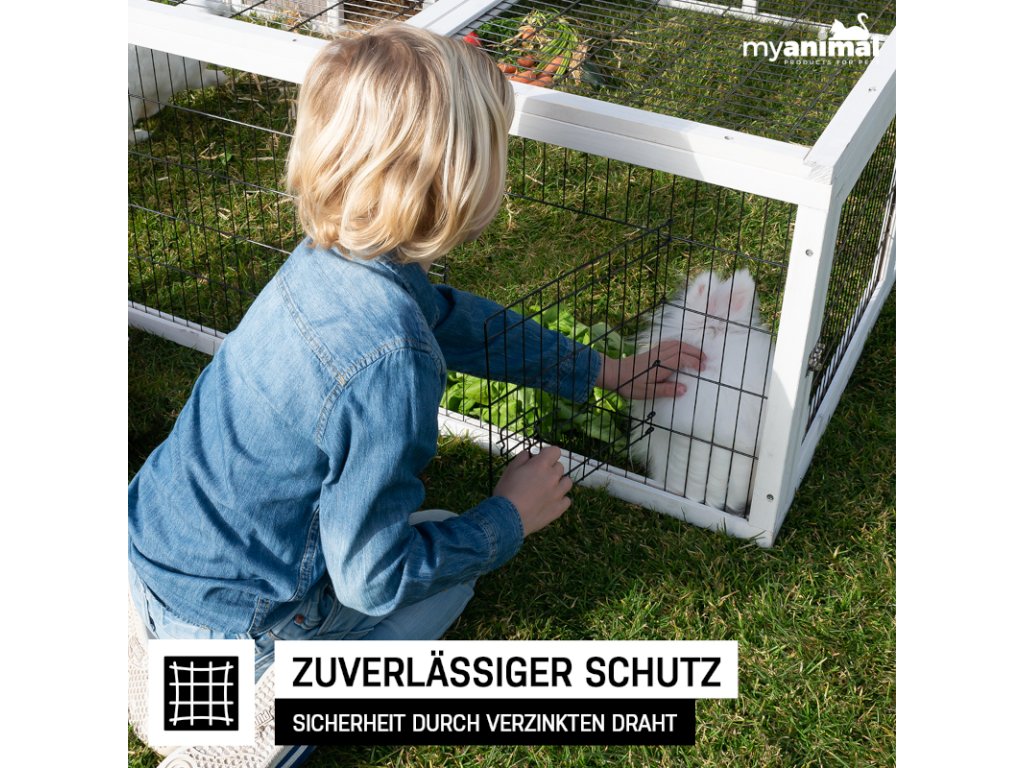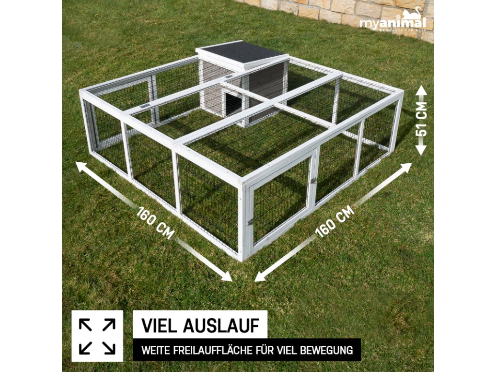 Králiky milujú objavovanie okolia skákaním – preto potrebujú dostatok pohybu. Okolnosť, v ktorej môže králikáreň MyAnimal MH-08 zabodovať svojimi veľkorysými rozmermi 160x160x51 cm. Králikom teda ponúka dostatok priestoru na skákanie, hranie a šantenie. Vonku sú dobre chránené aj pred predátormi: králikáreň je zo všetkých strán oplotená pozinkovaným drôtom, ktorý sa nedá ohýbať ani hrýzť. Po nastavení králikáreň XXL ponúka vašim miláčikom nielen veľa priestoru a pohodlia, ale aj maximálnu bezpečnosť.