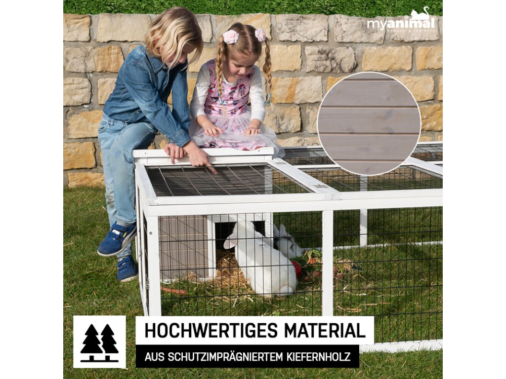 Králikáreň MyAnimal MH-08 s vonkajším výbehom sa vyznačuje najvyššou kvalitou: Králikáreň XXL je kompletne oplotená pozinkovaným drôtom a ponúka králikom tú najlepšiu možnú ochranu pred predátormi. Samotný drôt je starostlivo zakomponovaný, aby sa králiky nemohli zraniť. Domček a drevené prvky sú vyrobené z robustného borovicového dreva, ktoré bolo ošetrené špeciálnou ochrannou impregnáciou, a preto odolá každému počasiu. Vďaka kvalitným materiálom a starostlivému spracovaniu je králikáreň s voľnobežkou veľmi odolná - kvalita, ktorú je vidieť!
