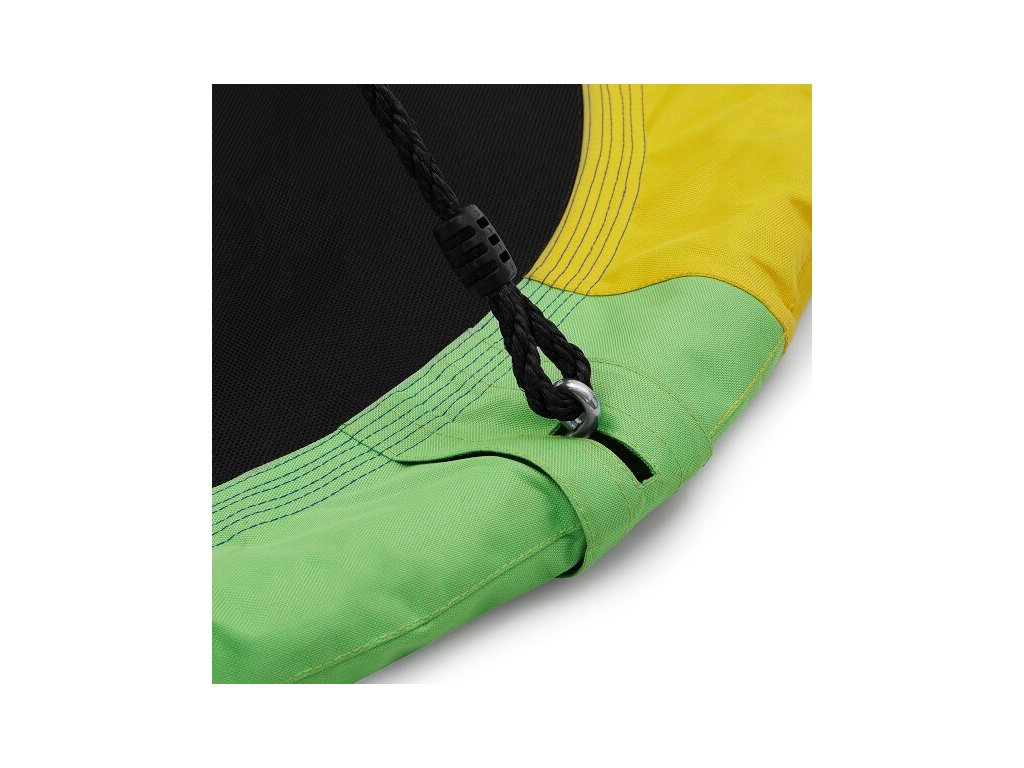 Rám s priemerom 90 centimetrov je vyrobený z oceľovej guľatiny s priemerom 25 milimetrov, na ktoré je pre maximálne bezpečie nalepená vysoká vrstva PE peny. Poťah modelu NB5003 je vyrobený z kombinácie polypropylénu a tkaniny Oxford 600D, ktorá je maximálne odolná voči poškodeniu a poveternostným vplyvom ako je dážď a sneh, hniezdo tak nemusíte schovávať keď práve začne pršať. Nosná, polyetylénová lanká majú priemer 10 milimetrov a dĺžku 180 cm. Keď tieto vlastnosti skombinujeme tak získame priestrannú hojdačku s nosnosťou 150 kilogramov, na ktoré sa vybláznia aj viac detí naraz.