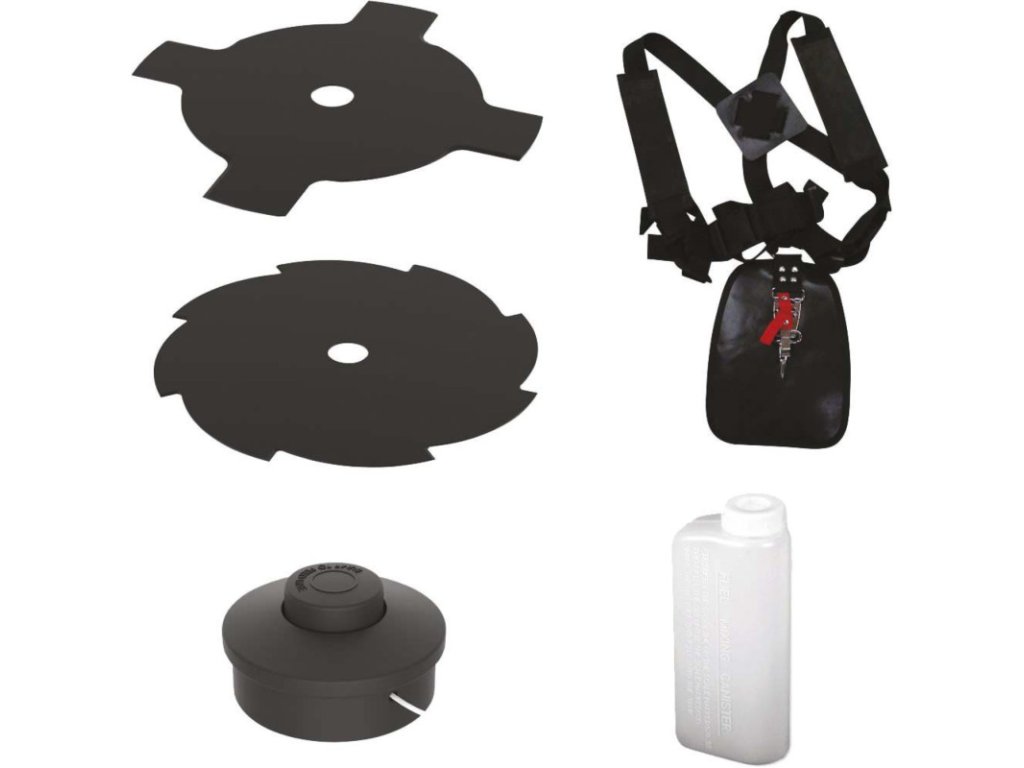 Príslušenstvo: Žacia hlava, 2x žací nôž, dvojramenný popruh, nádoba na miešanie paliva, sada náradia.
