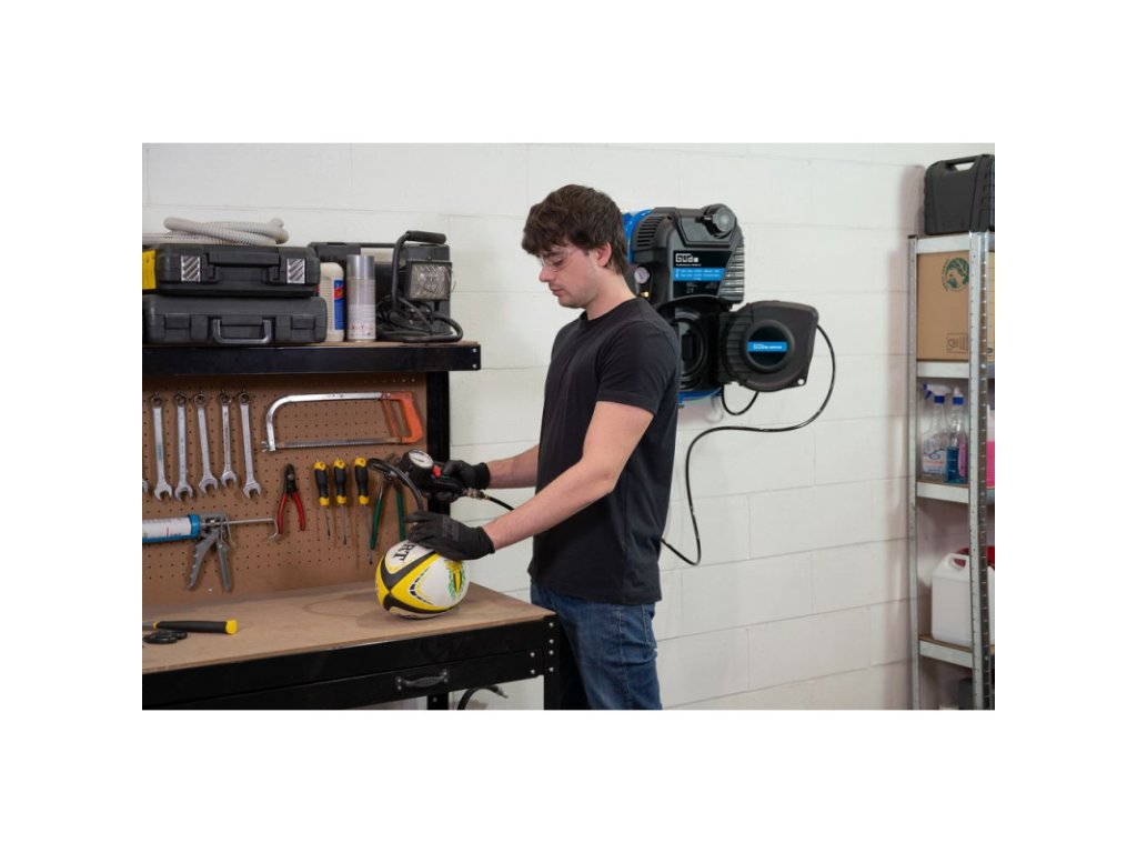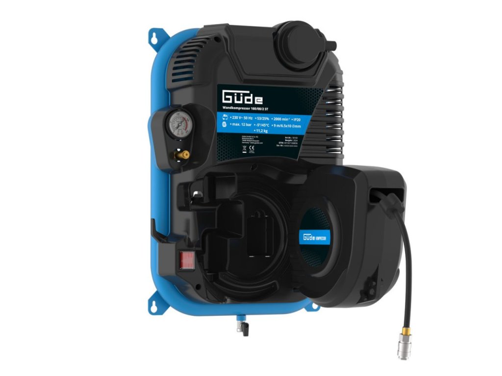Nástenný kompresor GWK 160/8/2 ST nesmie chýbať na stene v žiadnej garáži alebo dielni. Ako naznačuje názov modelu, túto stanicu stlačeného vzduchu je možné namontovať na akúkoľvek stenu, aby sa ušetrilo miesto a nezaberala cennú plochu na podlahe. Kompresor s nízkou hlučnosťou dodáva tlak 8 bar a hadicový navijak otočný o 180° zabezpečuje pracovný rádius 9 metrov. Samozrejme, tento kompaktný kompresor je bezolejový, a teda bezúdržbový. Hadica na stlačený vzduch vystužená tkaninou je odolná voči oleju aj teplotám do -20 °C a je bez problémov prejazdná autom, keď je pod tlakom. Stanica stlačeného vzduchu pre montáž na stenu, vrátane kompresora a integrovaného automatického navíjača hadice. Vhodný pre autá, motocykle, pneumatiky bicyklov, nafukovacie matrace, lopty a mnohé iné.