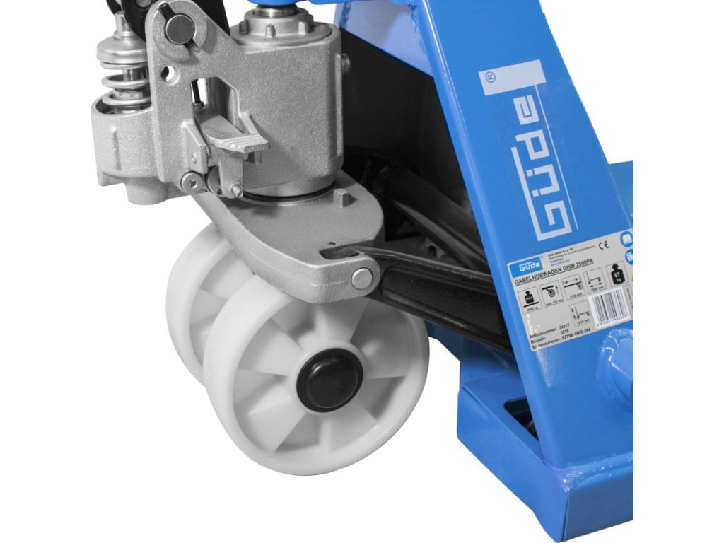 Paletový vozík pomáha pri preprave nákladov v sklade alebo v dielni. Jeho stabilná zostava s oceľovou konštrukciou odolnou voči skrúteniu a stĺpikom riadenia otočným o 180° zaisťuje malý polomer otáčania. Nosnosť paletového vozíka je 2500 kg. Funkcia zdvíhania sa vykonáva pomocou oja s ovládaním ventilu. Funkciu spustenia je možné vyvolať na rukoväti a dodatočne na integrovanom nožnom pedáli. Polyamidové kolieska, pomocné nábehové valčeky na naloženie palety zboku.