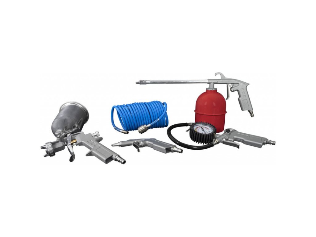 Pištoľ na striekanie farby so spádovou nádobkou s rýchlospojkou. Hustilka pneumatík s rýchlospojkou. Vyfukovacia pištoľ s rýchlospojkou. Špirálová hadica s rýchlospojkou. Striekacia pištoľ na olej s nádobkou z oceľového plechu s rýchlospojkou.