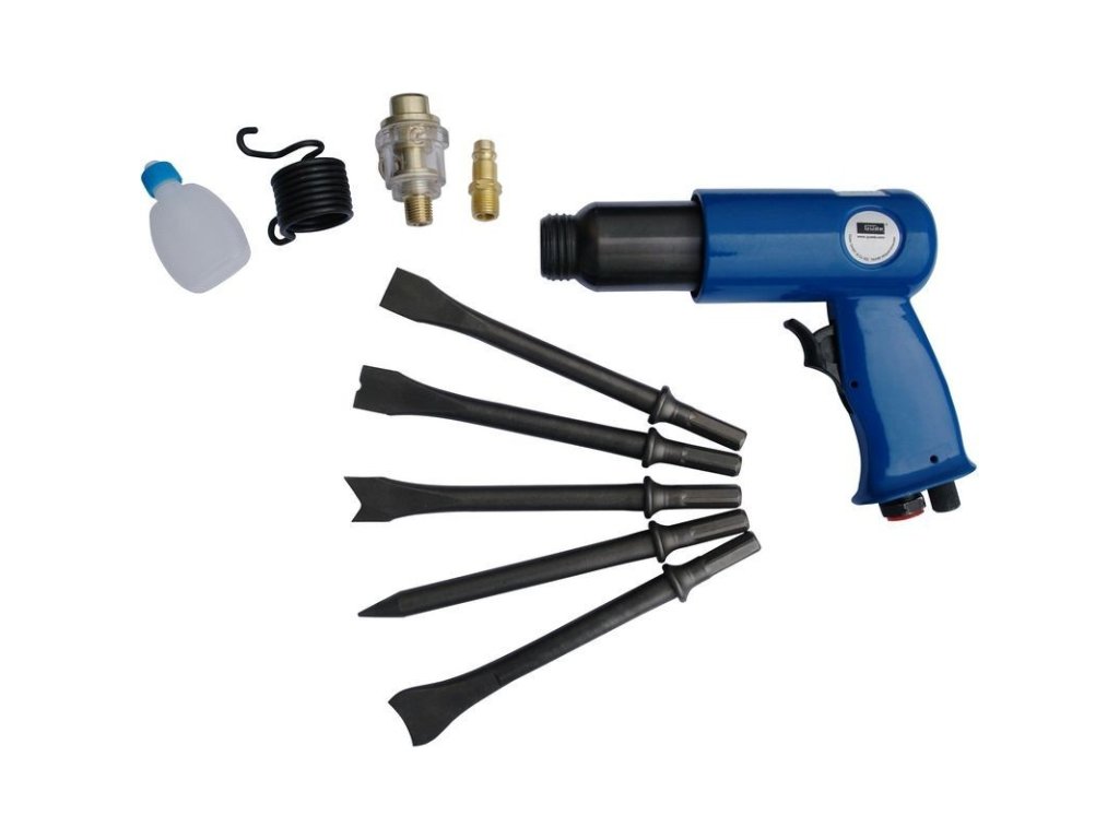 Pneumatické sekacie kladivo s piatimi sekáčmi, určené predovšetkým pre karosárske práce (odsekávanie hlavičiek nitov, oddeľovanie plechov alebo bodových zvarov), ale aj na vyhotovenie zásekov a rýh do stien (elektroinštalácia) a podobne. Systém upínania sekáčov (šesťhranná stopka, Ø 10 mm), zaručujúca ich fixný pohyb bez nechceného pretáčania. Plochý sekáč, sekáč na nity, oddeľovací sekáč, univerzálny sekáč, špicatý sekáč, prídržná pružina, olejnička, vsuvka. Sada v praktickom plastovom kufríku.