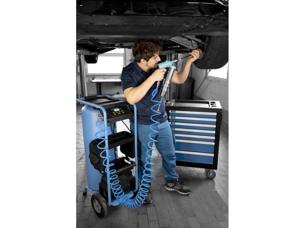 Pneumatická maznica, použiteľná s DIN mazacími kartušami alebo priamym plnením z veľkoobjemových zásobníkov. Obsah sady: uhlová tryska s hubicou, pružná mazacia hadica s hubicou, hubica, ručná páka (pre aplikáciu mazív ručným spôsobom), vsuvka.