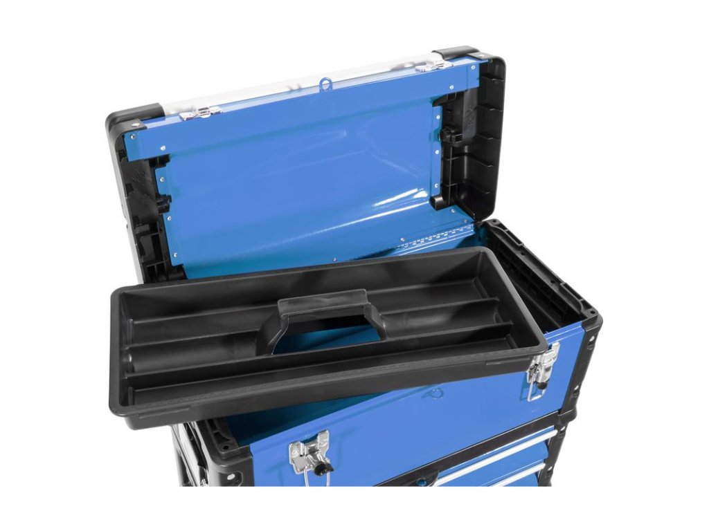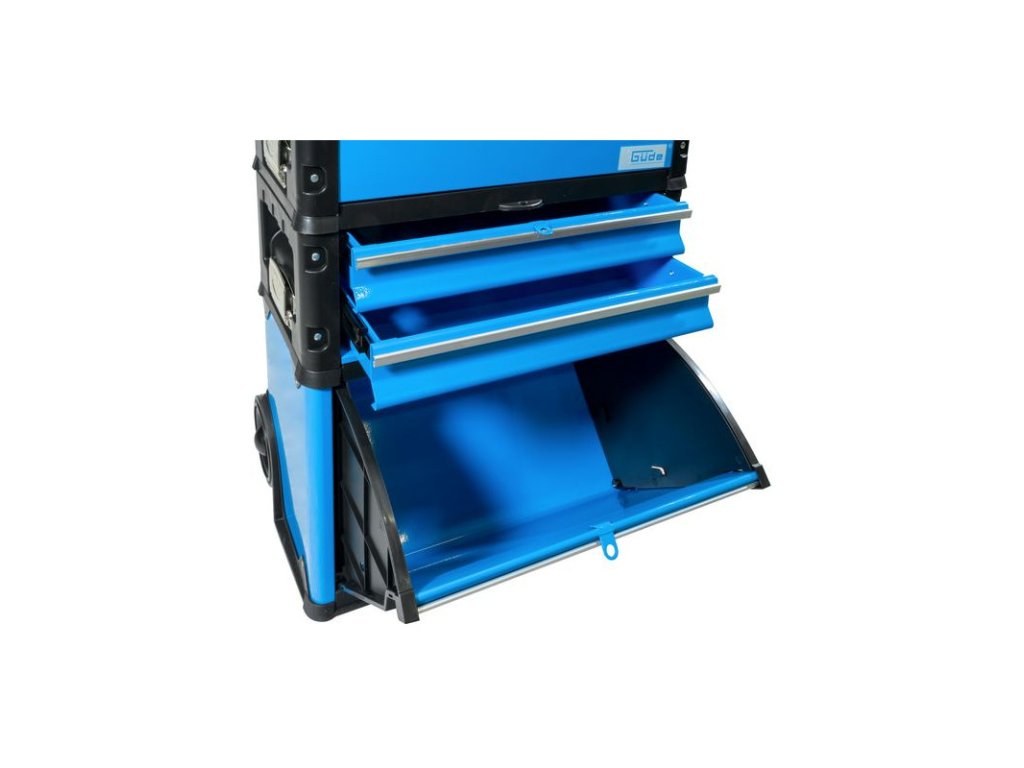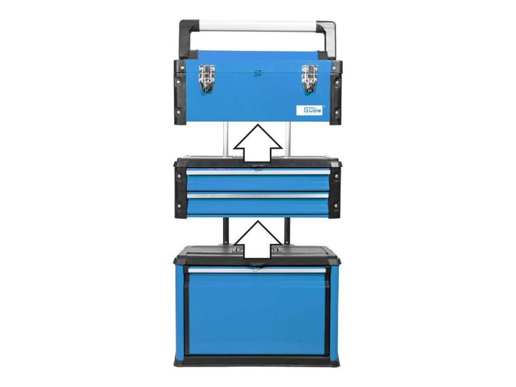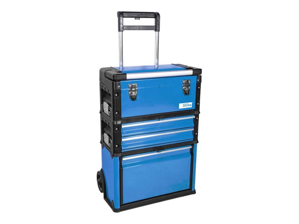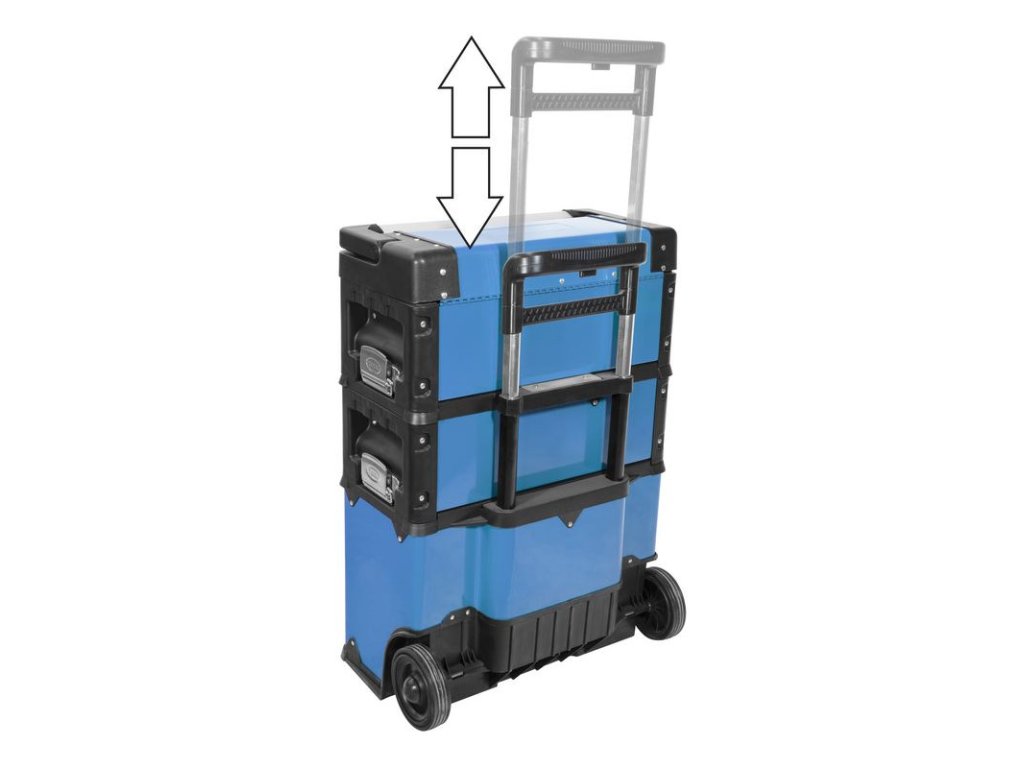 Trojdielny modulárny kufor na náradie. Odoberateľný kufrík na náradie s vložkou na malé súčiastky a náradie. Odoberateľný modul s dvoma zásuvkami (uloženými na guľôčkových ložiskách). Veľký vyklápací kontajner (vrátane vodiacich tyčí). Všetky tri moduly s držadlami na prenášanie, teleskopická rukoväť. Uzamykateľné visiacimi zámkami, konštrukcia z kovu a plastu, stabilné, veľké kolieska z tvrdenej gumy.