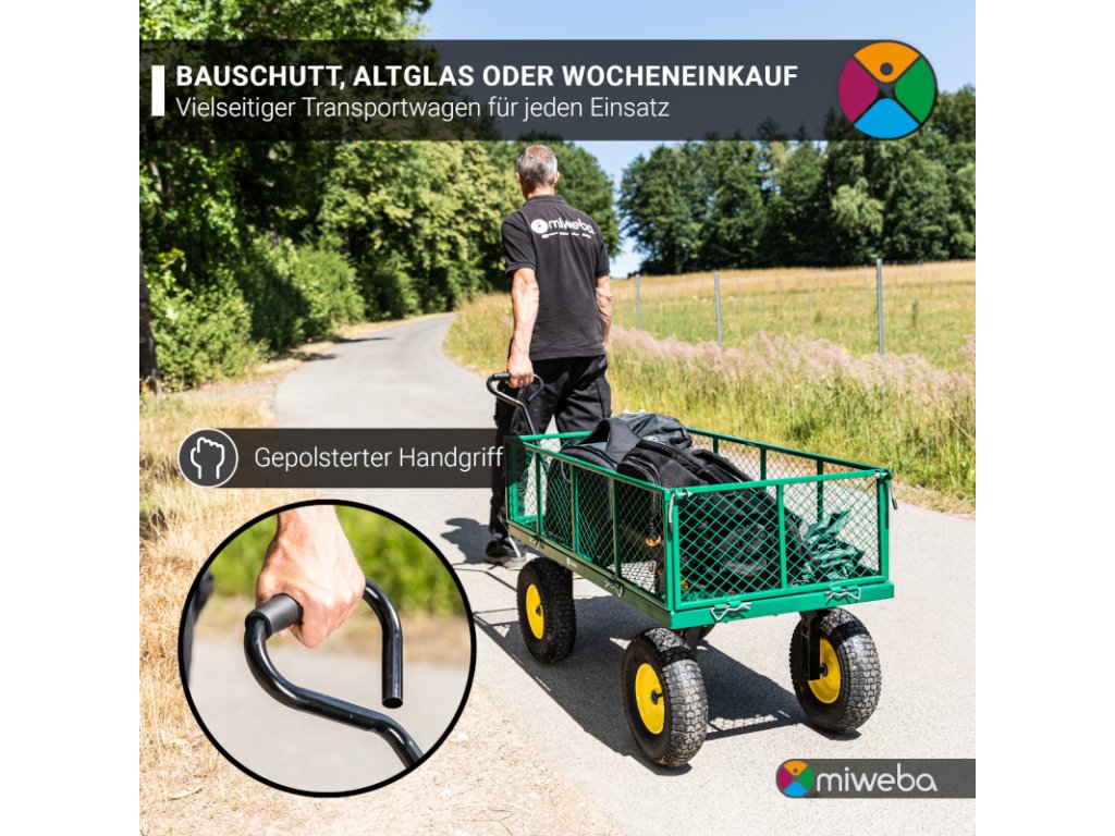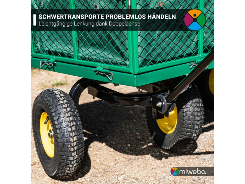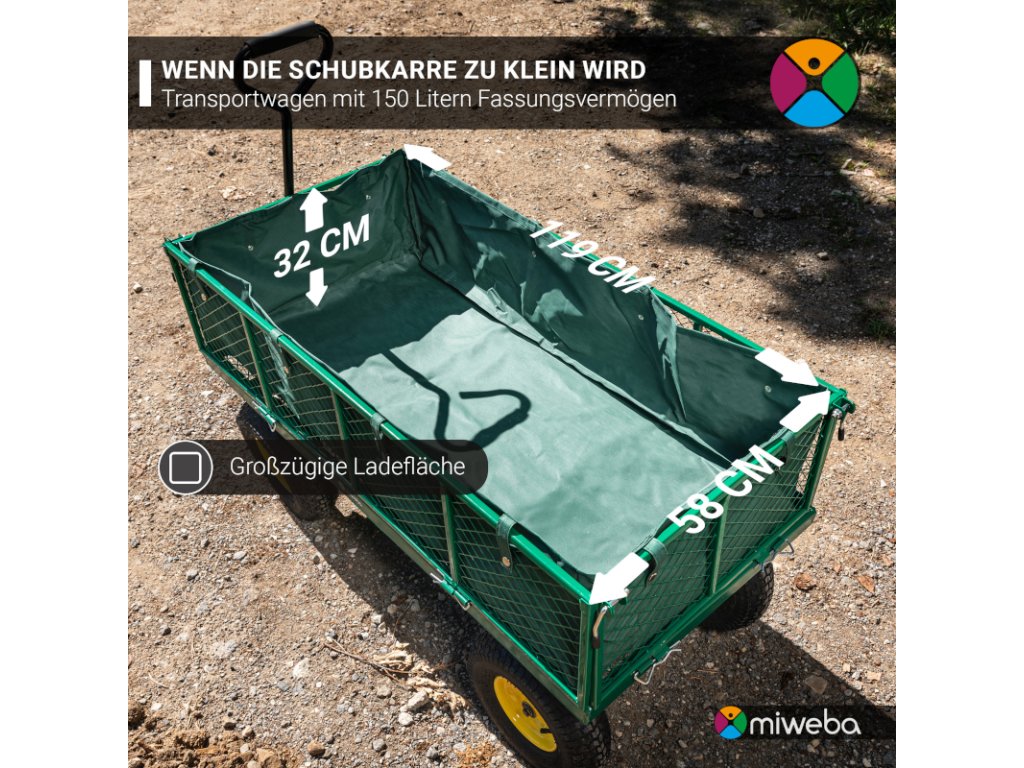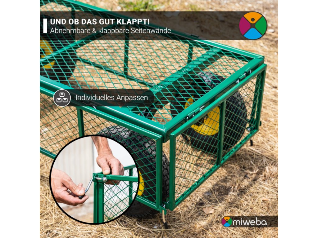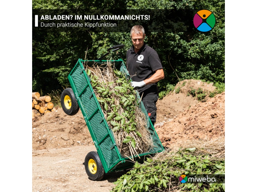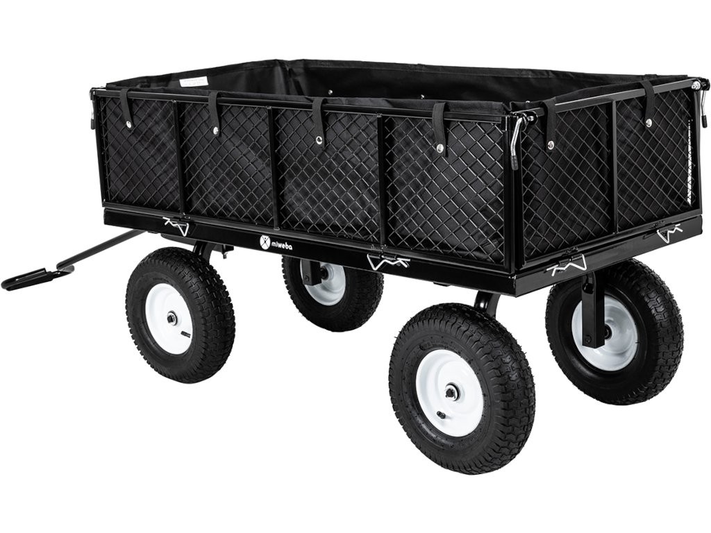 S ručným vozíkom Miweba MB-700 sú vaše práce na záhrade rovnako jednoduché ako výlet s množstvom batožiny. Pretože odolá neuveriteľnej záťaži 700 kg! Aj pri maximálnom zaťažení je riadenie vďaka dvojitej náprave vždy príjemne plynulé. Vďaka odolnej plachte a robustnému oceľovému rámu ľahko prepravíte stavebnú suť alebo svoje týždenné nákupy z bodu A do bodu B. Potrebujete viac miesta? Potom jednoducho odstráňte bočné steny. S ručným vozíkom Miweba máte skvelého všestranného pomocníka. A profitujte z jeho všestranných vlastností!