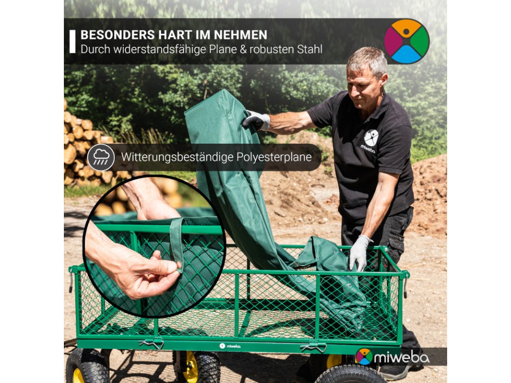 Aby ručný vozík Miweba MB-700 zostal dlho po vašom boku ako spoľahlivý partner, boduje kvalitnými materiálmi. Odnímateľná polyesterová plachta je obzvlášť odolná voči poveternostným vplyvom. Jeho vlákna sa vyznačujú extrémne vysokou odolnosťou proti roztrhnutiu.