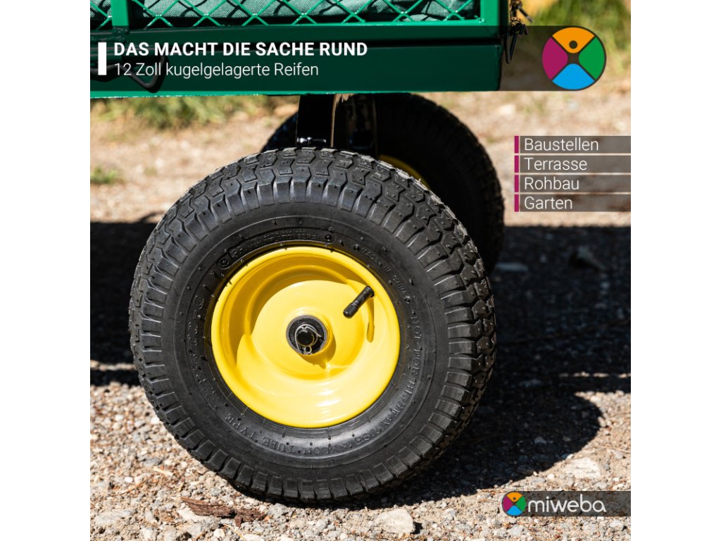 Na stavbách alebo pri rozostavanej terase a záhrade býva podlaha často nerovná. Aby ste mohli napredovať na akomkoľvek povrchu, ručný vozík Miweba MB-700 má 12-palcové pneumatiky s guľôčkovými ložiskami.