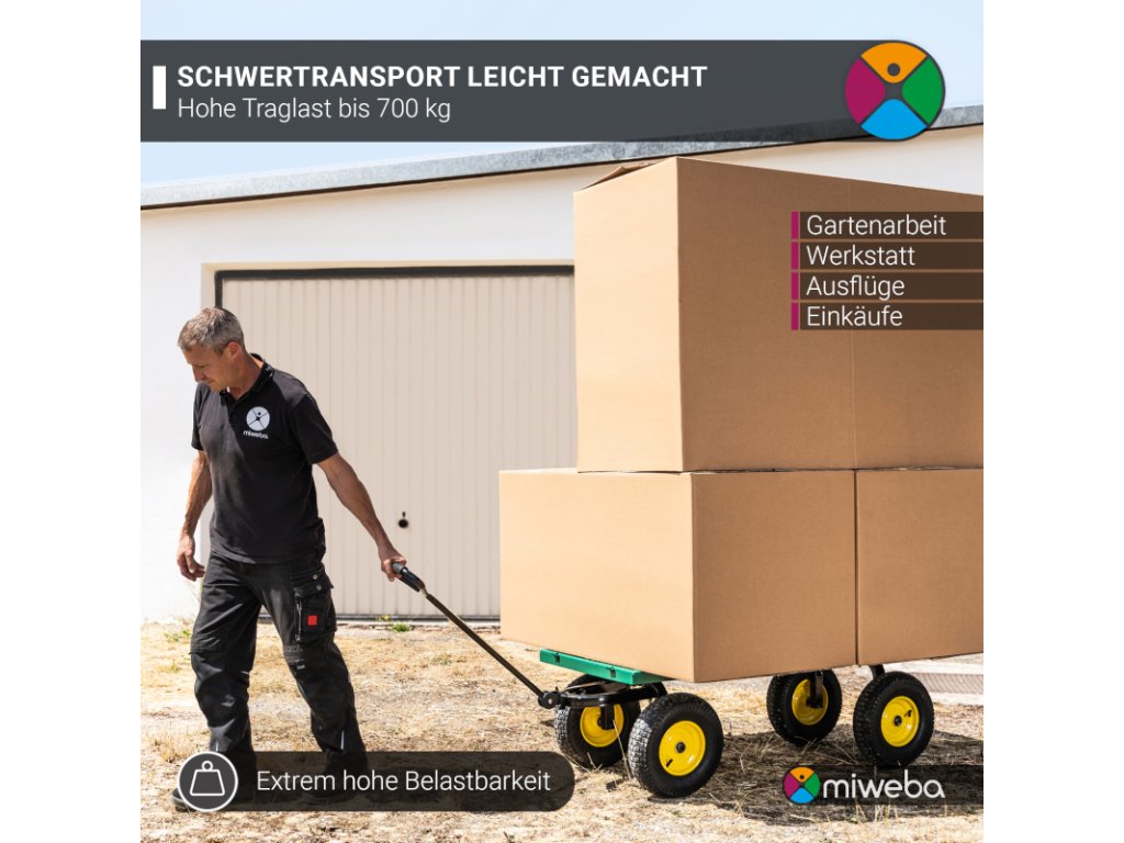 Chceli by ste aj vy bez námahy presúvať veľké a ťažké predmety? Žiaden problém! Pomôže vám s tým ručný vozík Miweba MB-700. Je mimoriadne odolný – s nosnosťou až 700 kg . To uľahčuje prepravu predmetov pri práci na záhrade, v dielni alebo na výletoch.
