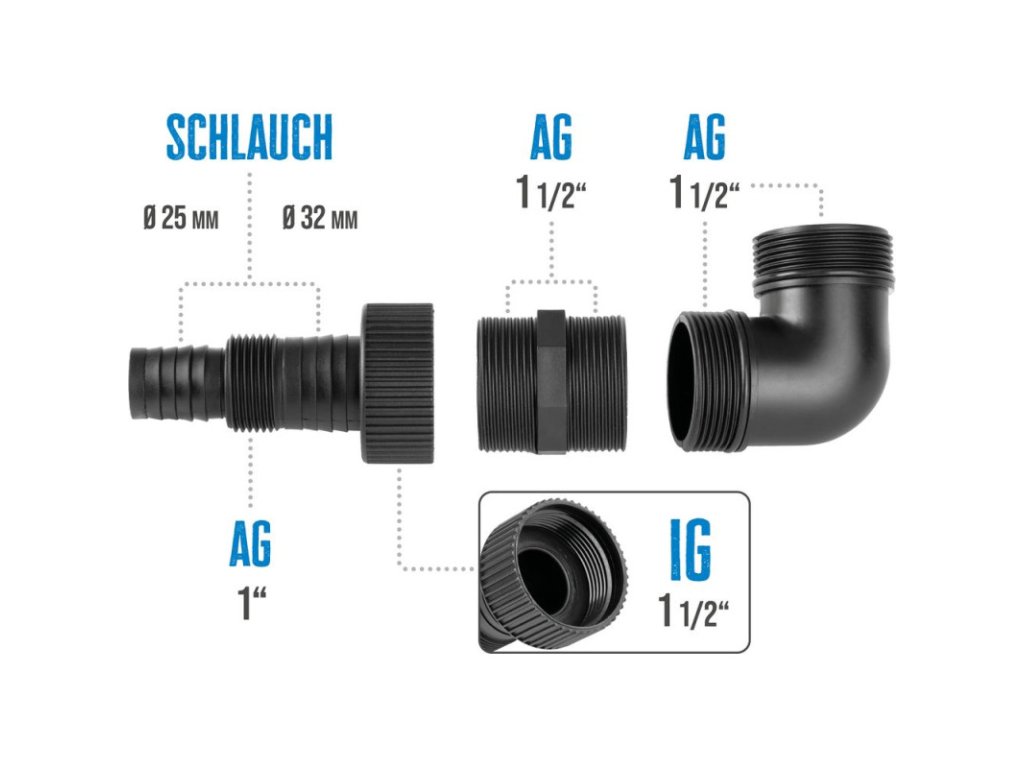 Hadicová prípojka s vonkajším závitom pre ponorné čerpadlá, pre priemer hadice 25 mm alebo 32 mm, závit 1" AG alebo 1 1/2" AG. Vhodná pre Čerpadlo na plytkú vodu GFS 401 S (kód tovaru: 94627), Kombinované ponorné čerpadlo GS 750 3v1 (kód tovaru: 94636), Ponorné kalové čerpadlo GS 4001 (kód tovaru: 94601), Ponorné kalové čerpadlo GS 8501 (kód tovaru: 94602), Ponorné kalové čerpadlo GS 7501 I (kód tovaru: 94603), Ponorné kalové čerpadlo GSX 1101 (kód tovaru: 94604), Ponorné kalové čerpadlo GS 7501 PI (kód tovaru: 94632), Ponorné kalové čerpadlo GS 1102 PI (kód tovaru: 94634).