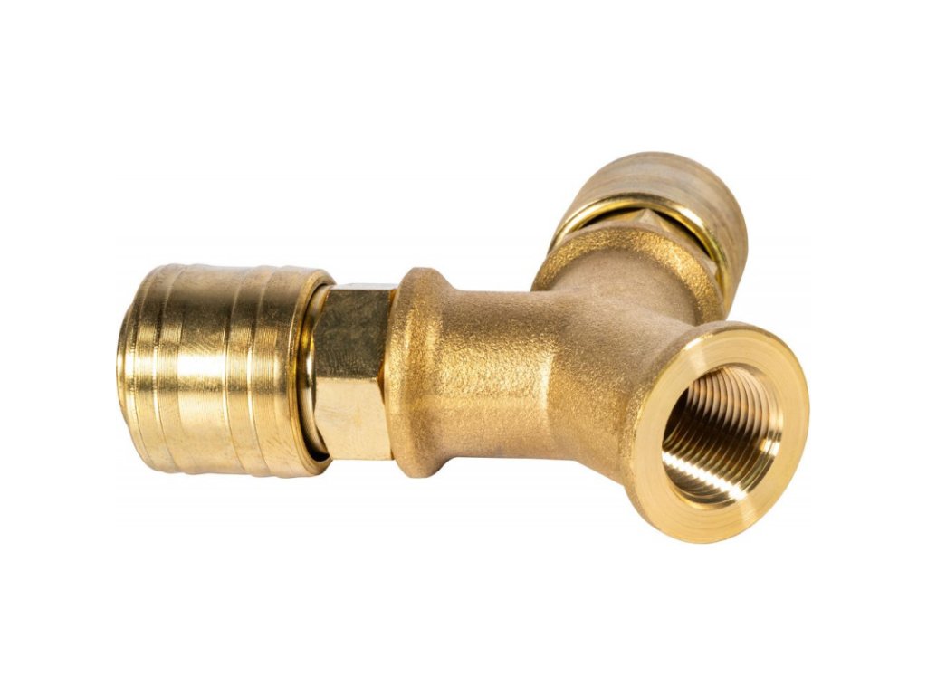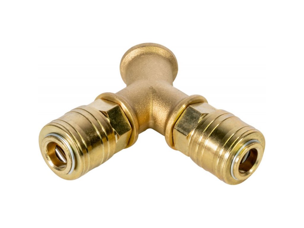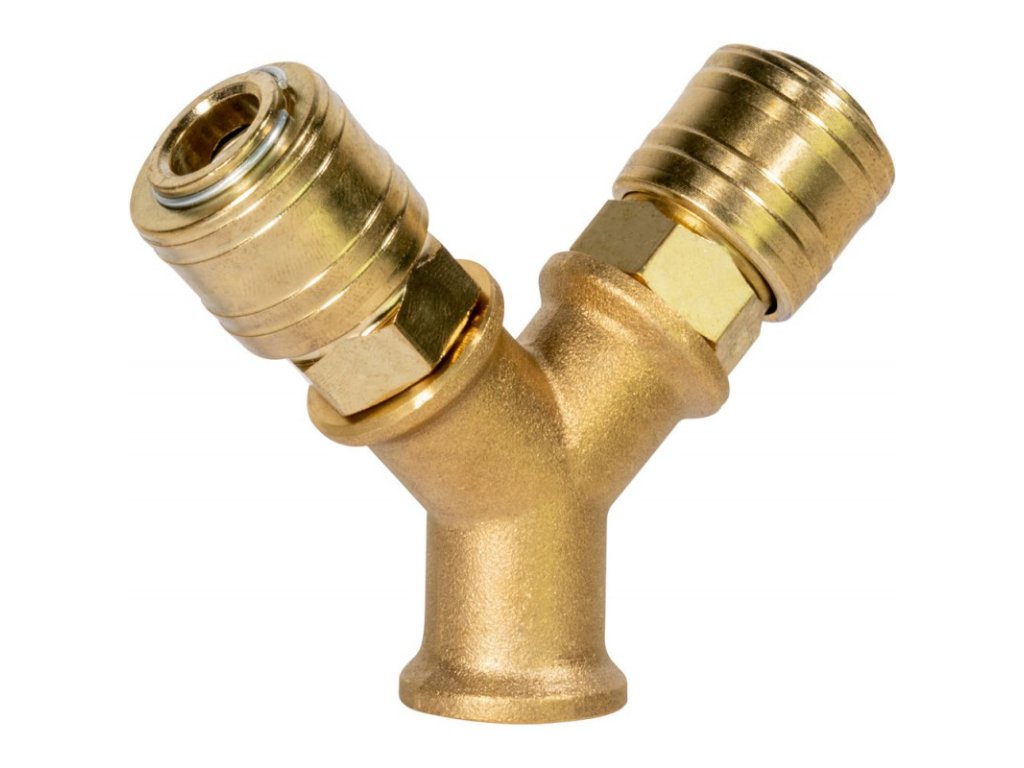 Mosadzný rozdeľovač s dvoma spojkami. V balení 1 ks.