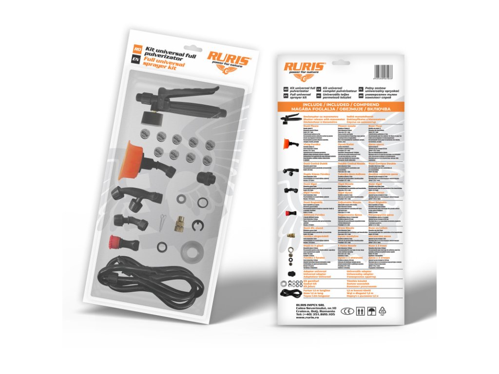 Kompletná univerzálna súprava postrekovačov môže vybaviť celý rad postrekovačov RURIS s vymeniteľnými tryskami. Trysky, ktoré súprava obsahuje, majú širokú škálu priemerov, aby dokázali pokryť všetky práce potrebné pri ovocinárstve alebo iných aplikáciách.