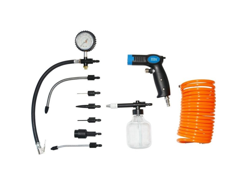 Vyfukovacia pištoľ s rôznymi možnosťami použitia vďaka rôznym nadstavcom. V sade sa nachádza vyfukovacia pištoľ, hustilka pneumatík, adaptér na fúkanie nafukovacieho matraca 3,5 cm, vyfukovací nadstavec 11,5 cm, ohybný vyfukovací nadstavec 19,5 cm, striekacia pištoľ 270 ml, Venturiho dýza, plniaca ihla na lopty kovová, plniaca ihla na lopty PVC, špirálová hadica 5 m.