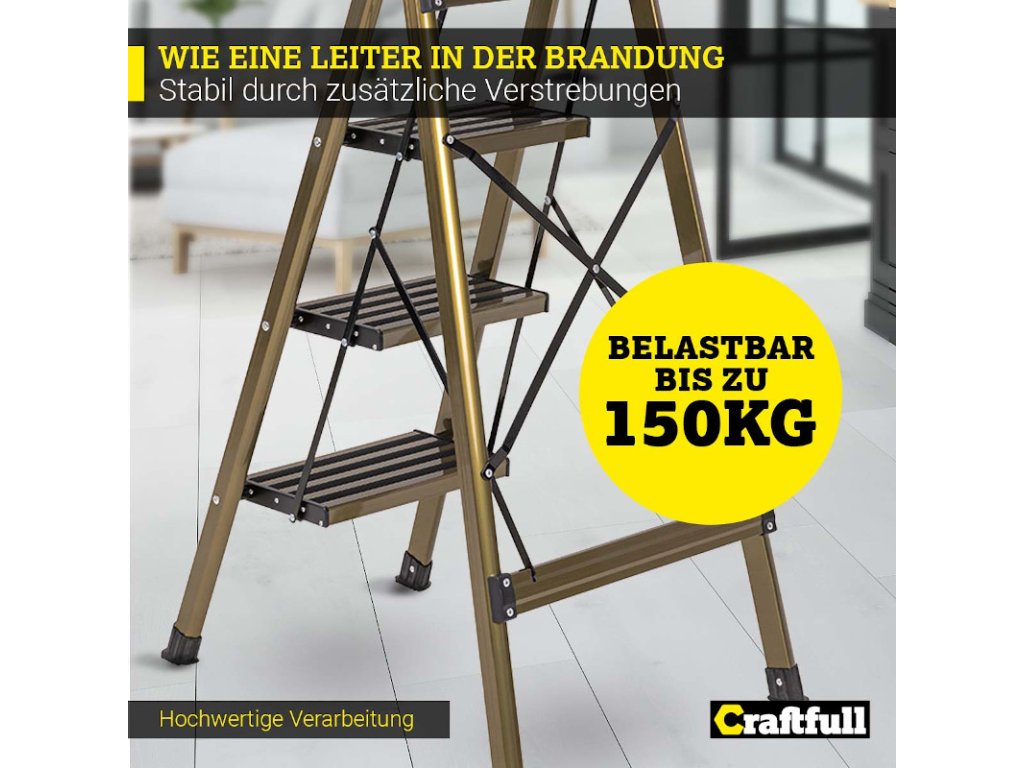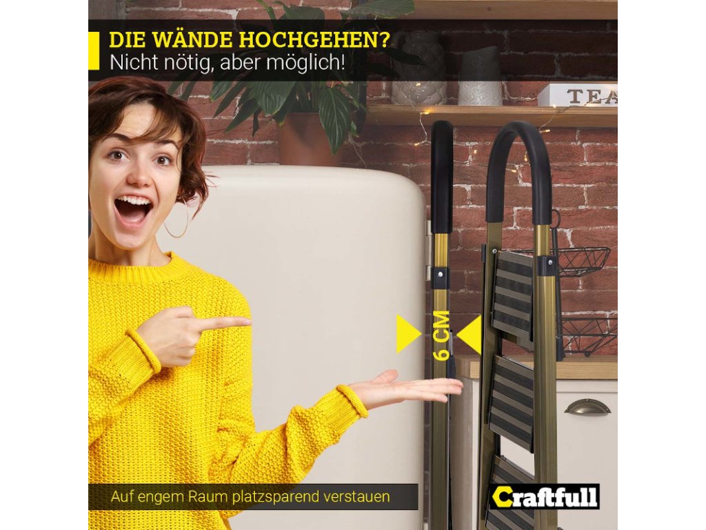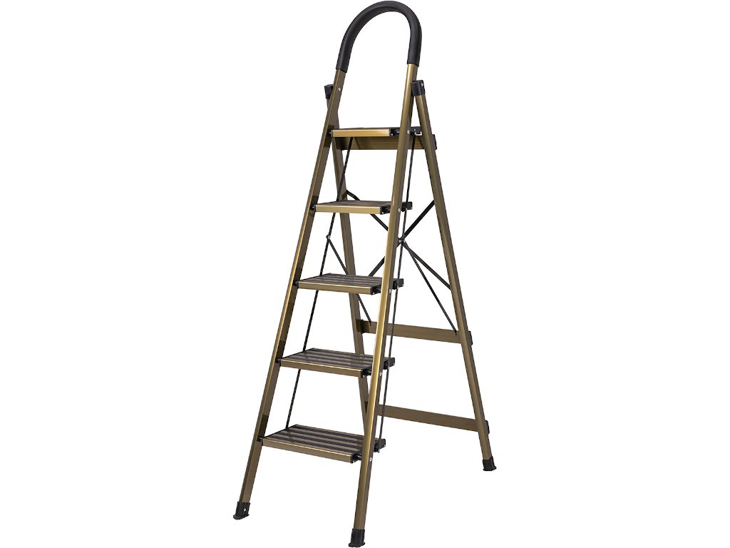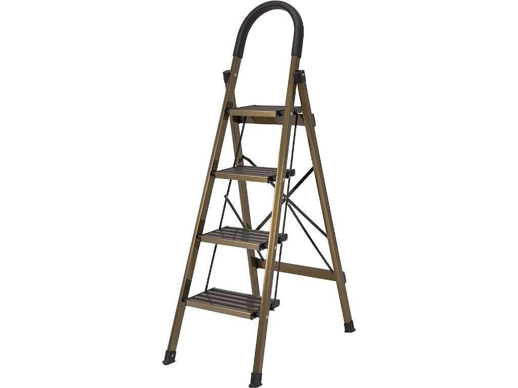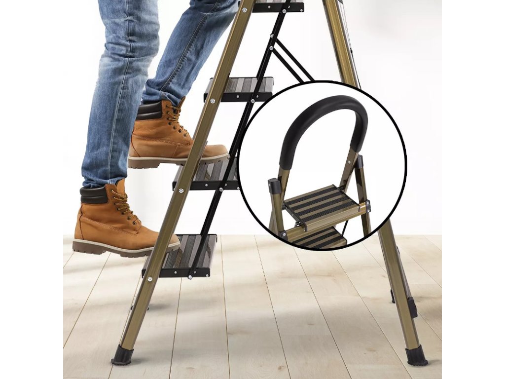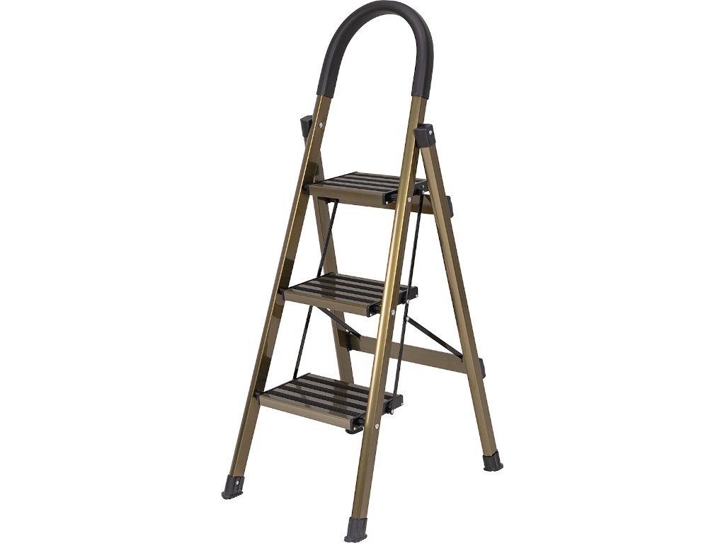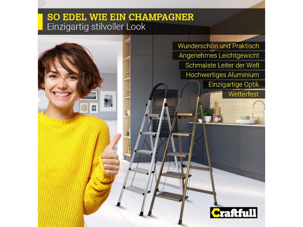 Rebrík CF-134A si určite všimne každý! Malebná kombinácia zlatej šampanskej farby s nadčasovou čiernou vytvára osobitý vzhľad. Vysoko kvalitný materiál pod dizajnom zostáva okom neviditeľný: prvotriedny hliník. Vďaka tomu je rebrík pre domácnosť obzvlášť ľahký a pohodlný na nosenie.