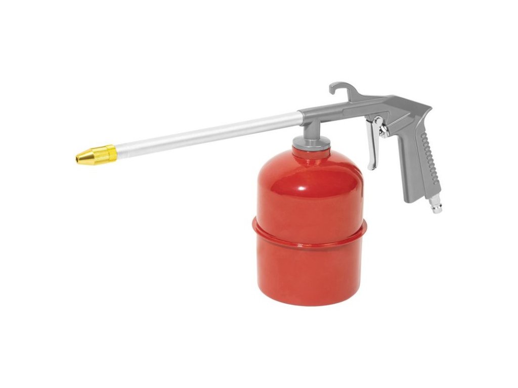 Striekacia pištoľ s rukoväťou a ventilom z tlakovo liateho hliníka, na striekanie čistiacich prostriedkov, tekutého vosku, aerosolového oleja a podobne, prípojná vsuvka.