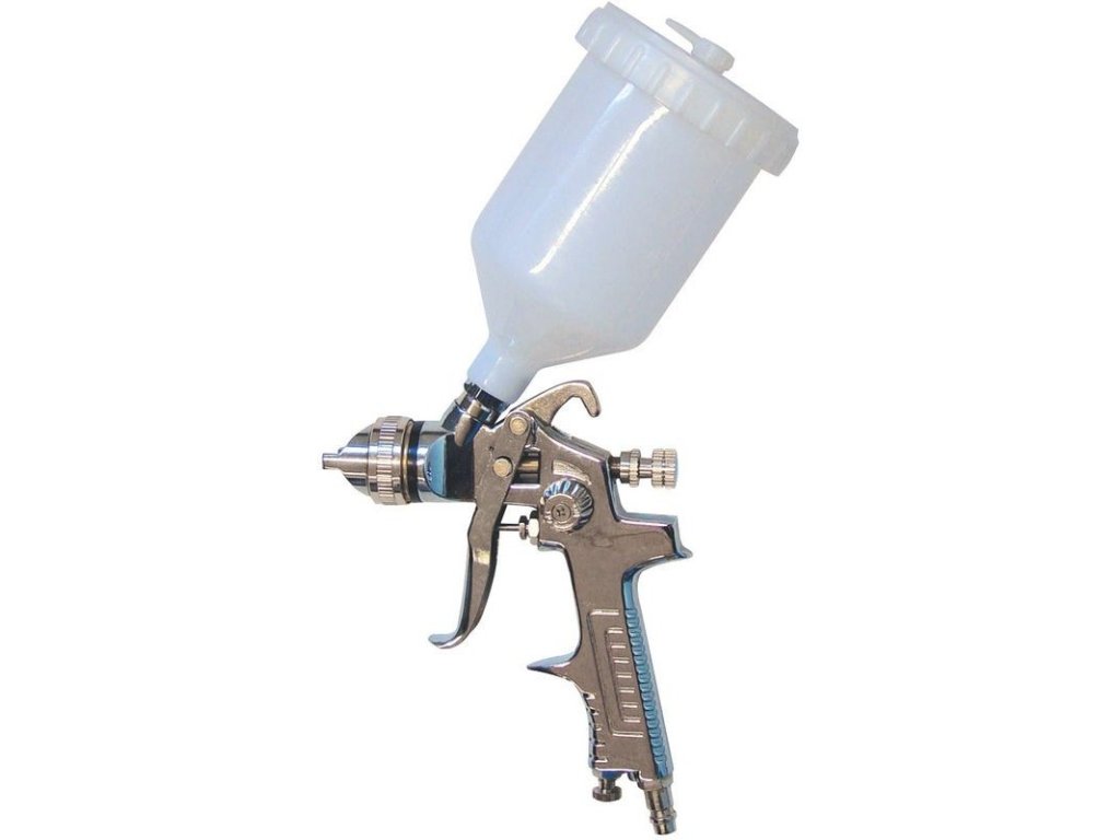 Profesionálna striekacia pištoľ s plastovou spádovou nádobkou a technológiou HVLP, vhodná pre všetky lakýrnické práce – aplikácia lakov, akrylátov, polyuretánu, epoxidu, plničov, smaltov alebo glazúr. HVLP (jemné rozprašovanie náterovej hmoty - maximálna prenosová účinnosť - úspora nanášaného materiálu), regulovateľné množstvo náterovej hmoty/stlačeného vzduchu i typu nástreku (kruhový/plochý). Korpus pištole a nádobka z lešteného hliníka, čistiaca kefka, servisný kľúč, vsuvka.