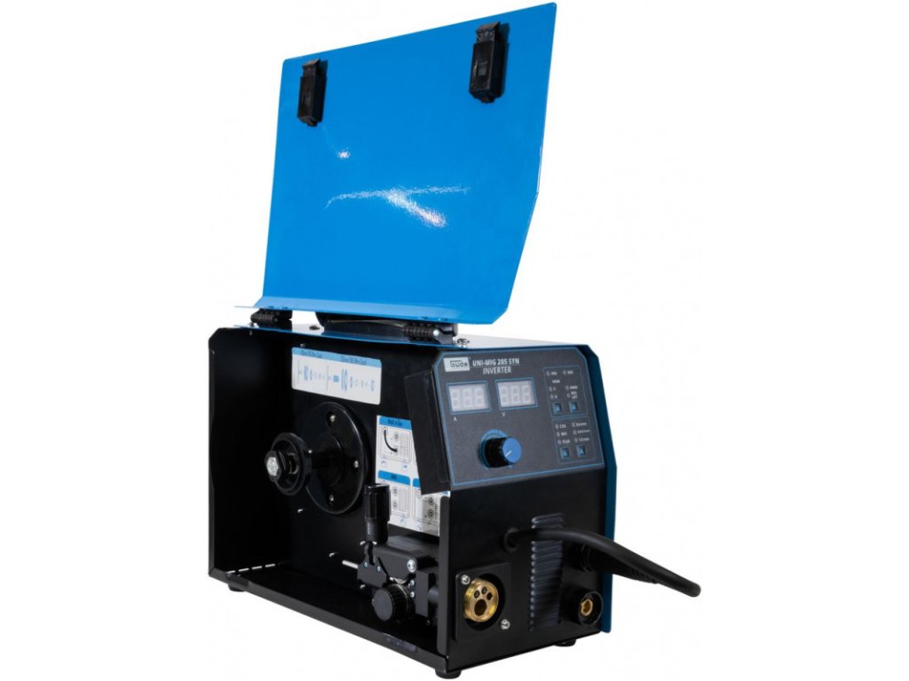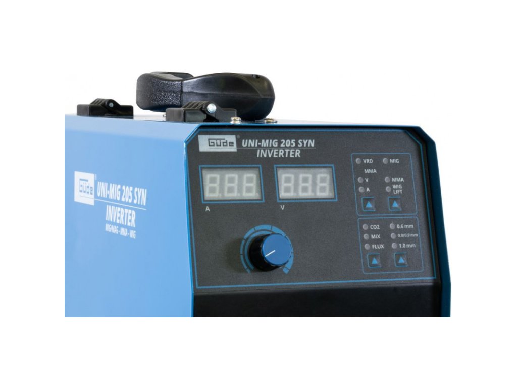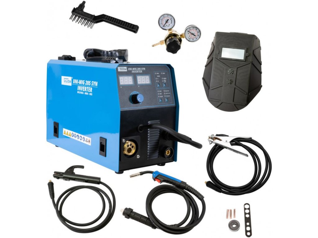 Invertorová zváračka Uni-Mig 205 SYN patrí medzi univerzálne invertorové zváračky v produktovom rade spoločnosti Güde. So zváračkou Uni-Mig 205 SYN sú možné prakticky všetky štyri zváracie procesy: MIG-MAG, MMA (zváranie elektródou), Flux (zváranie plneným drôtom), aj zváranie WIG (voliteľné). Osvedčené doplnkové vlastnosti ako Anti-Stick (zabraňuje prilepeniu elektródy k obrobku), Hot Start (pre optimálne zapaľovanie elektródy) a Arc Force (stabilizuje oblúk automatickým nastavením zváracieho prúdu a zaisťuje tak dokonalé výsledky zvárania) zaisťujú maximálny komfort pri zváraní, a to aj v náročných podmienkach. Nový, inovatívny synergicky regulovaný posuv drôtu sa po výbere procesu zvárania, hrúbky drôtu a sily zvárania automaticky nastaví na správnu rýchlosť. Tieto doplnkové funkcie umožňujú najmä začiatočníkom a neskúseným zváračom okamžite dosiahnuť dobré výsledky zvárania. Držiak elektród a ukostrovacia svorka, ako aj kladivo s kefou pre procesy MMA sú súčasťou štandardnej výbavy. To isté platí aj pre horák MIG/MAG a regulátor tlaku na ochranný plyn. Vhodná na malé cievky a plastové cievky D200 (5 kg). Poriadok a optimálnu mobilitu zabezpečuje zvárací vozík, ktorý je tiež súčasťou dodávky. Kryt vyrobený z oceľového plechu s povrchovou úpravou práškovaním, tepelná ochrana proti preťaženiu. Trojmetrový hadicový zväzok s Euro prípojkou (MB15), 2,5-metrový uzemňovací kábel s ukostrovacou svorkou, 1,8-metrový držiak elektród 200 A. Prúdová tryska (0,6/0,8/0,9 mm). Dvojhodinový reduktor tlaku, dvojmetrová plynová hadica. Vrátane zváračského štítu, kladiva na trosku s kefkou a zváracieho vozíka na plynové fľaše. Doba zapnutia pri maximálnom zváracom prúde 230 V (MMA/MIG/MAG/WIG): 15%.